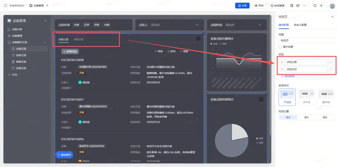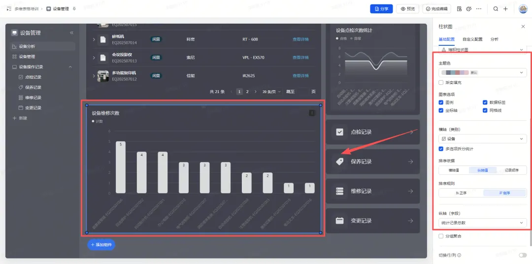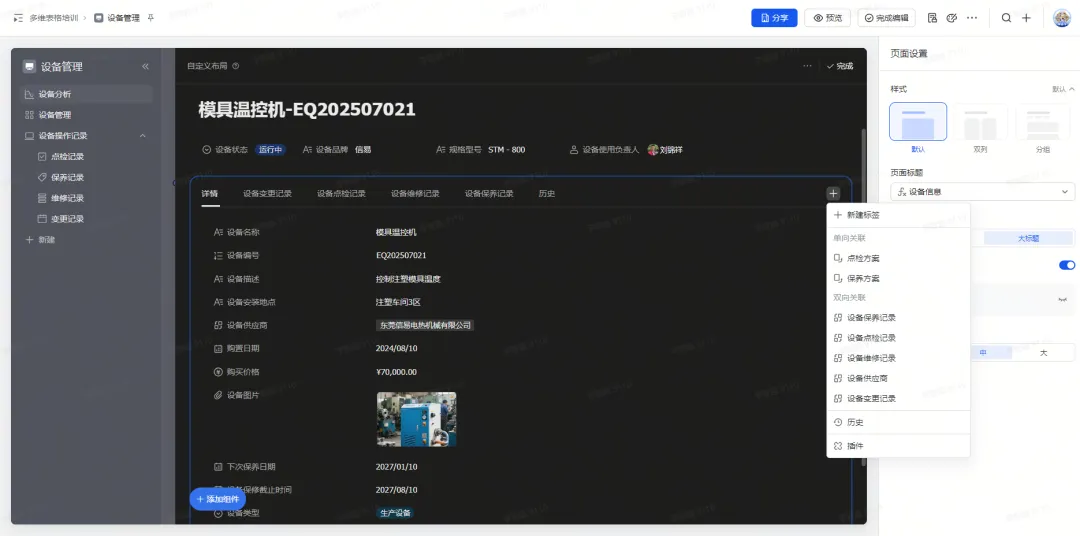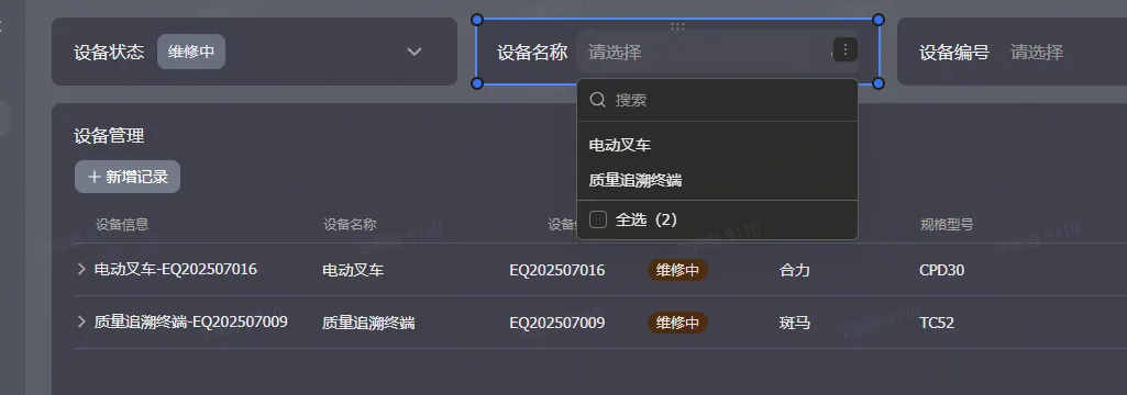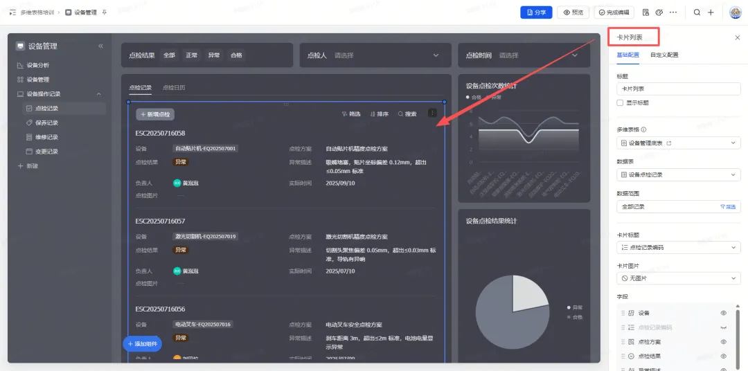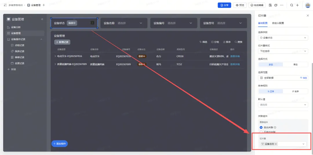 这里有个关键点:数据来自「维修记录表」,但显示的是「设备名称」。需要通过关联字段把两张表连起来。