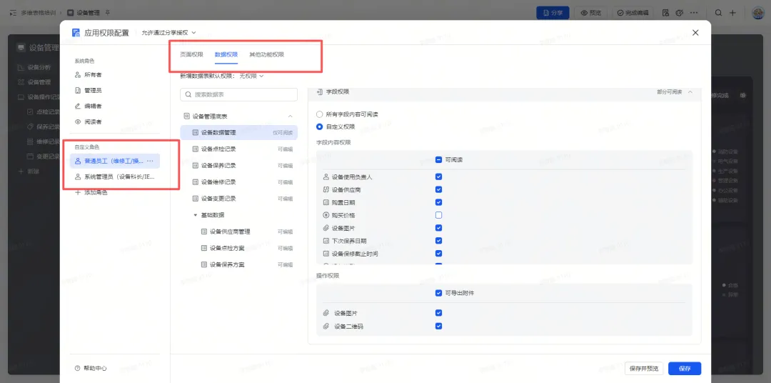 | 数据权限 | 只看自己负责的设备(行权限)隐藏「设备原值」「采购价格」(列权限) |