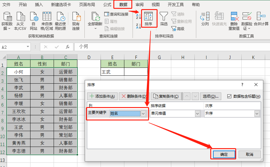 先选中数据区域,点击【数据】——【排序】——【主要关键字】——【姓名】——【确定】。