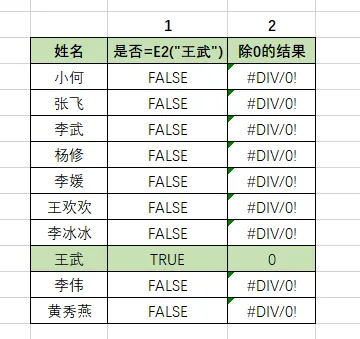 1) E2=A2:A12 先判断 A2:A12 (姓名列)是否等于E2("王武")。