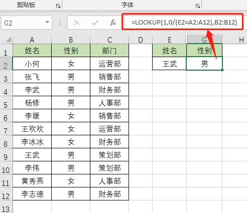 查找区域 A2:A12,即姓名列,找到与 E2 相同的值"王武";
