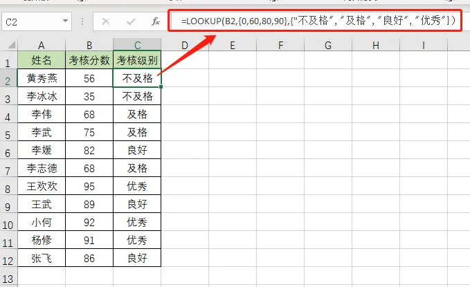 不及格:0~60 岁;及格:61~80岁 ;良好:81~90岁 ;优秀:91以上。=LOOKUP(B2,{0,60,80,90},{"不及格","及格","良好","优秀"})在一行或一列中查找值,返回另一行或另一列对应位置的值。=LOOKUP(lookup_value, lookup_vector, [result_vector])公式中查找值是 B2 查找区域是{0,60,80,90},返回结果区域是{"不及格","及格","良好","优秀"}Lookup函数在【查找区域】查找 小于或等于 【查找值】60的值是 56,并返回【返回结果区域】返回结果区域」对应的值:"不及格"。以上就是今天分享的干货技巧,你Get到了吗?别忘记动手练习鸭~office研习社,每天陪你学习一点点,进步一点点。