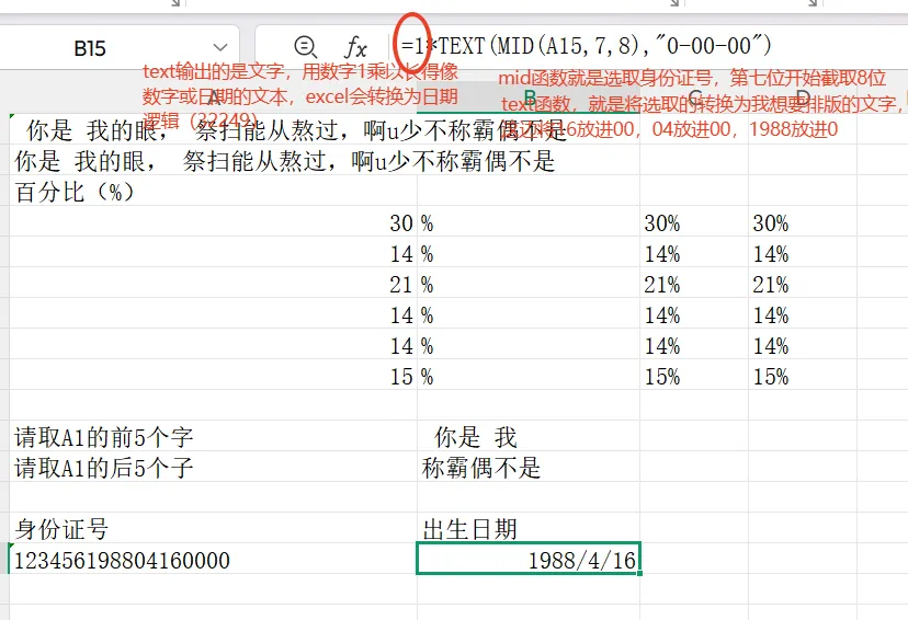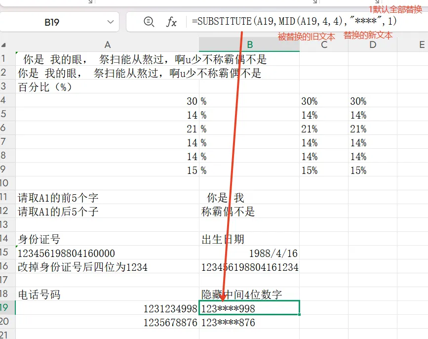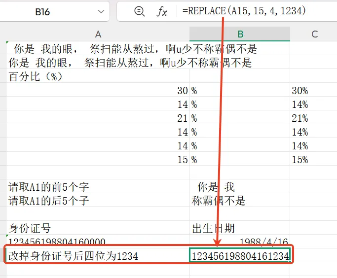 语法:=Replace(指定字串,哪个位置开始替换,替换几个字元,替换成什么)