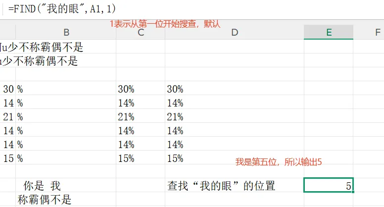 语法:=Find(要查找字元,指定字串,第几个字元)