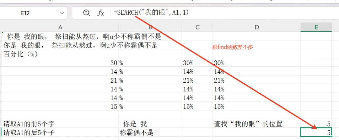 语法:=search(要查找的字元,字元所在的文本,从第几个字元开始查找)