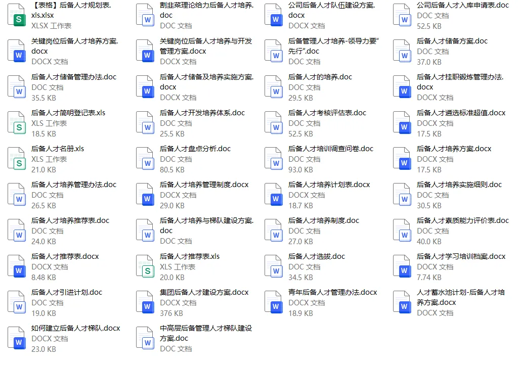 《后备人才培养技巧资料包》,共41份资料,包括包括后备人才培养PPT、后备人才培养资料,两大部分。