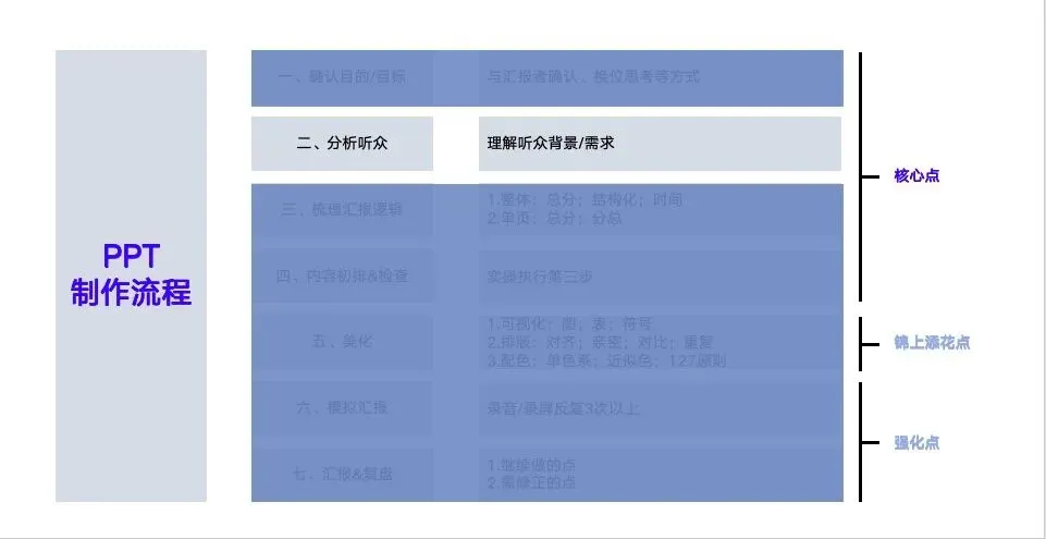 只有深入换位思考,分析听众,才能在第一步目标确认好后,精准的执行!
