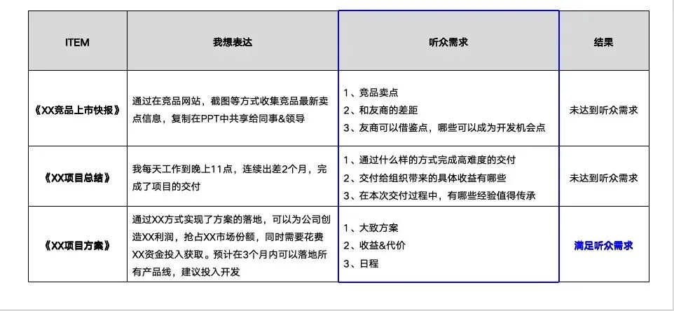 来看2个没有分析听众和1个分析听众的案例,可以看到如果只是一味的自以为是的表达,肯定完全猜不到听众需求的点上去,做的无用功!