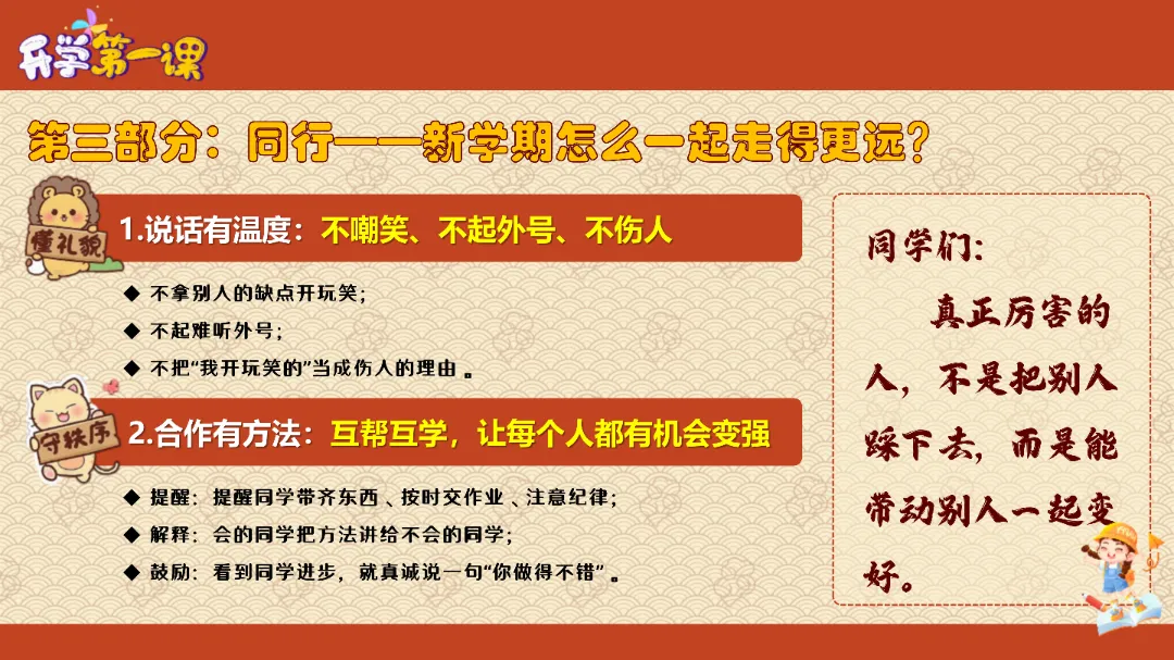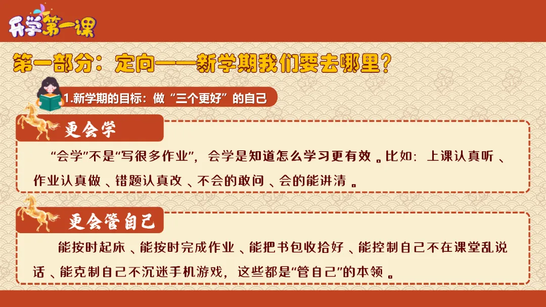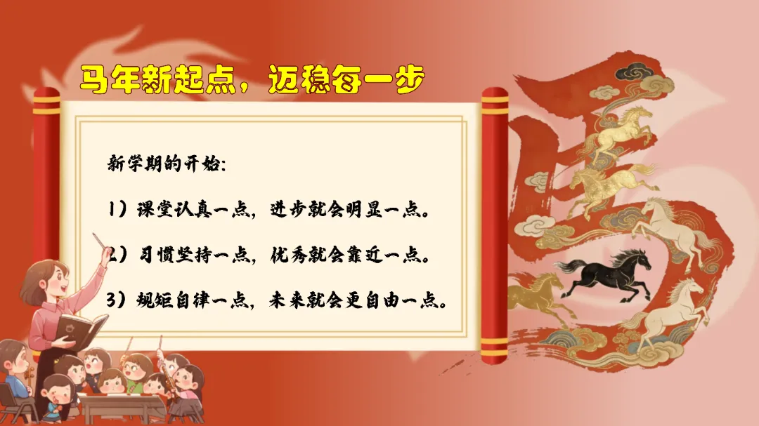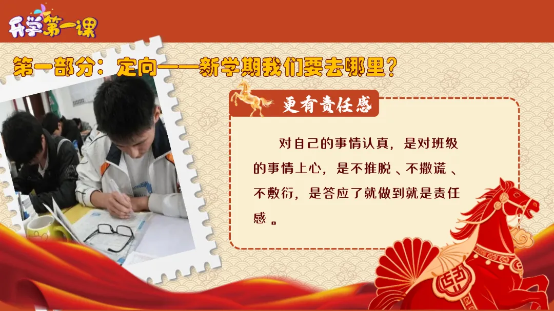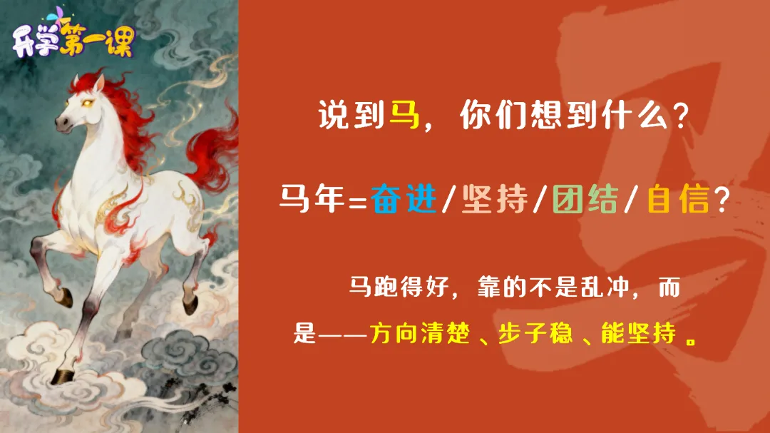 开学第一课主题班会课件PPT:“乘马年之风,向成长出发”(电子版可编辑,课件+逐字稿),部分内容由PPT展示可见。