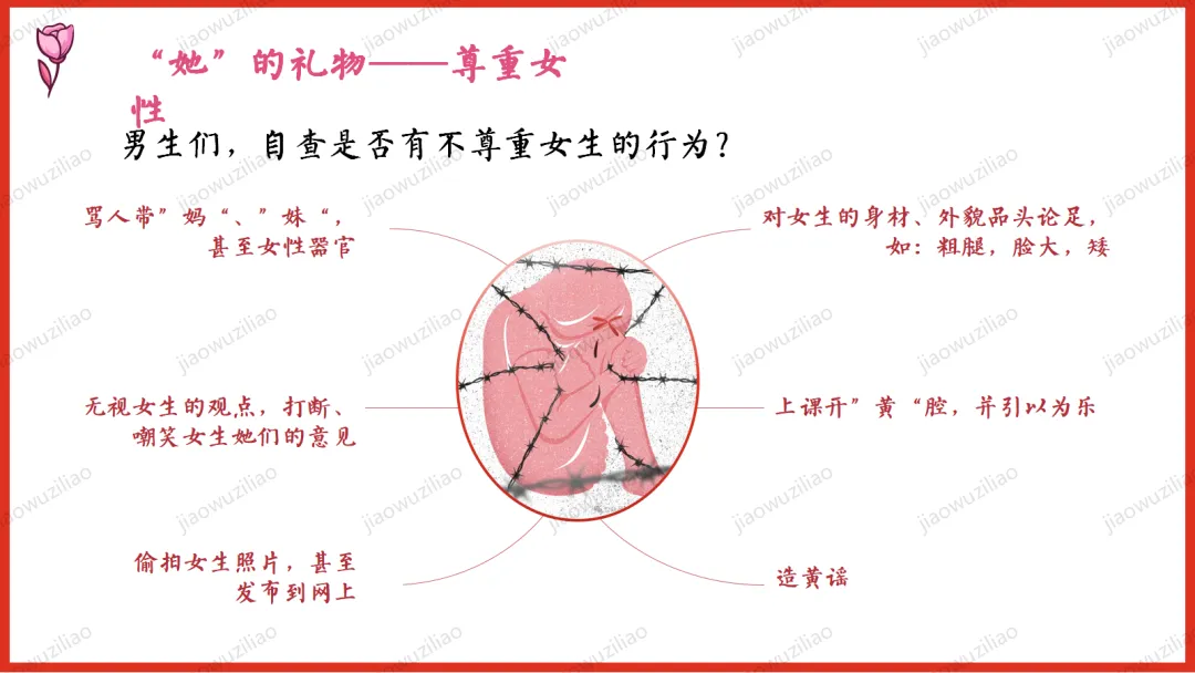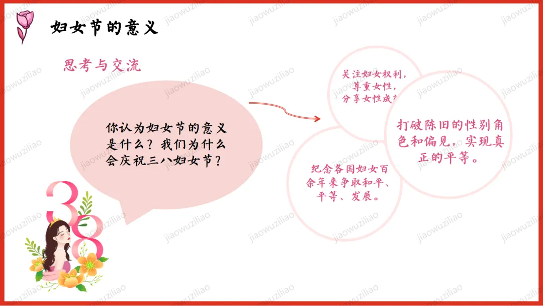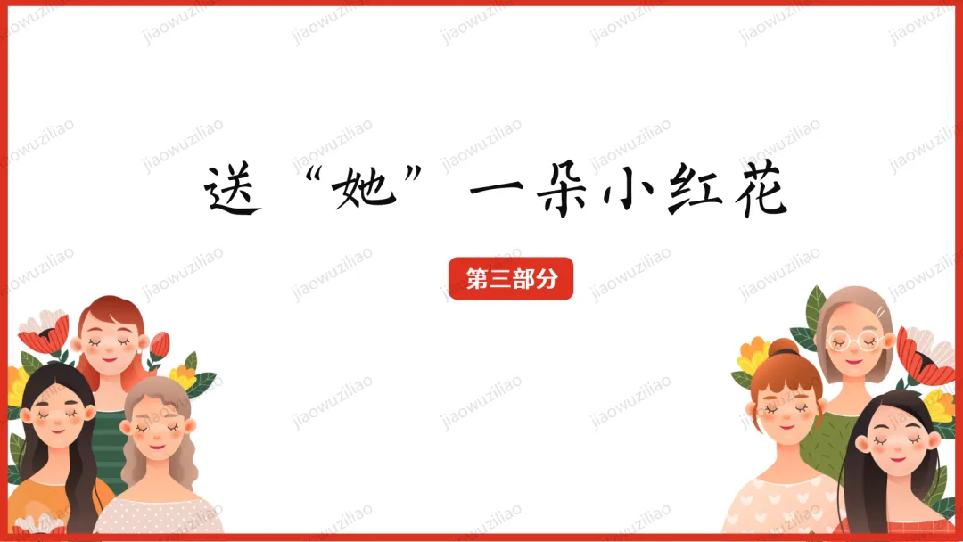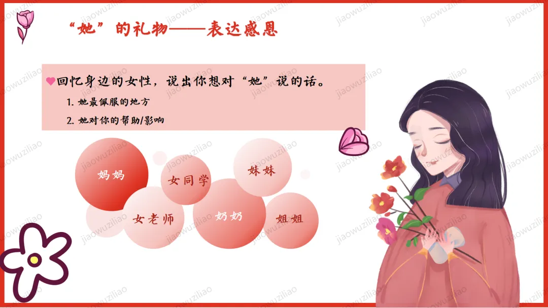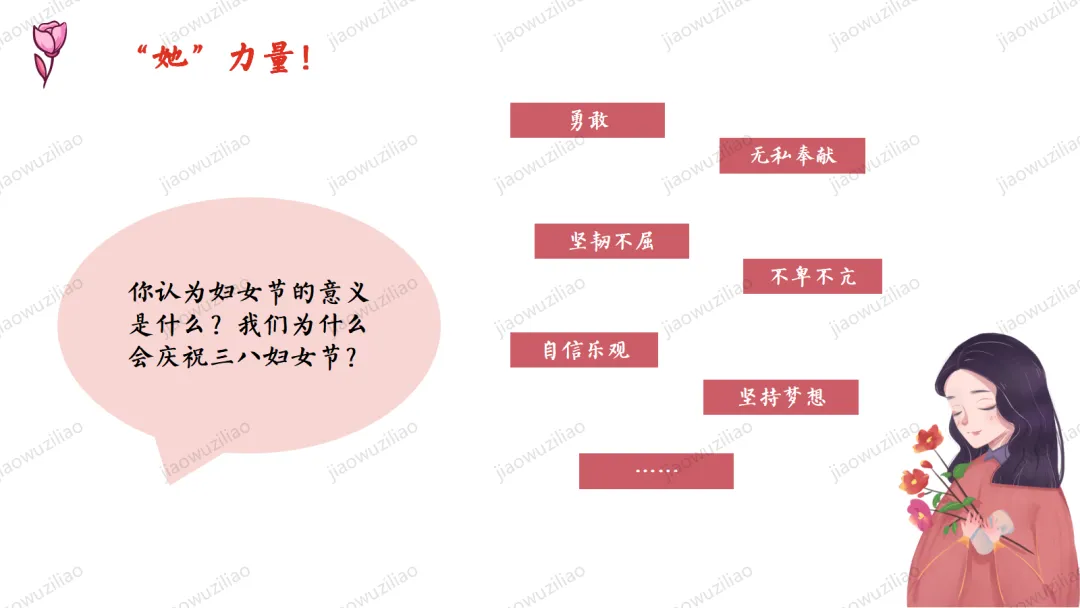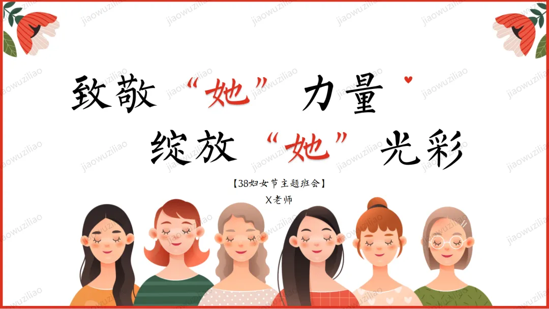 三月春风拂面,我们迎来三八国际妇女节。在生活中,母亲、老师、长辈与身边的女性,用温柔与坚强守护我们、温暖世界。本次班会,让我们学会感恩、尊重与赞美,向每一位了不起的女性致敬。愿同学们懂得关爱他人、珍惜付出,心怀敬意,向阳成长!如果您对这篇课件感兴趣,文末有课件的获取方式(PPT无水印,可编辑修改)关注下方卡片公众号有偿获取。(关注后+小编好友,再发课件的编号【3051】或截图。)免责申明:此资料来源于网络公开资源,仅用于学习交流使用,售价为整理资料的费用,我们尊重原创,版权归原作者。,如果侵犯到您的权益,请第一时间联系我们,我们将立即更正或删除相关内容.