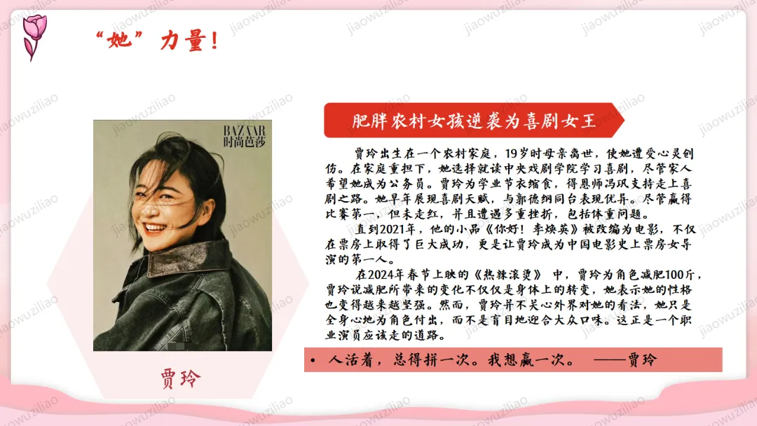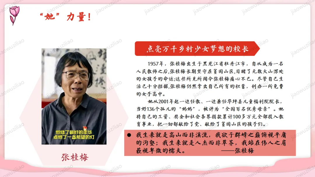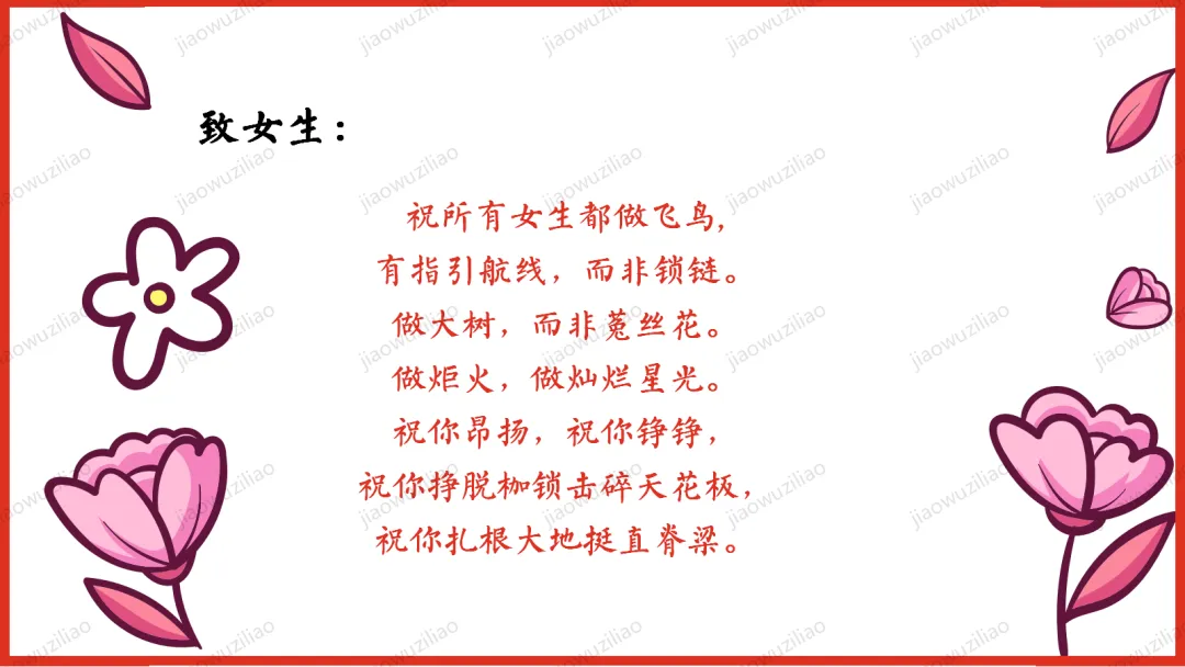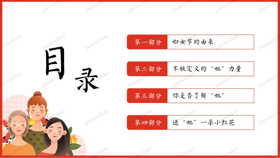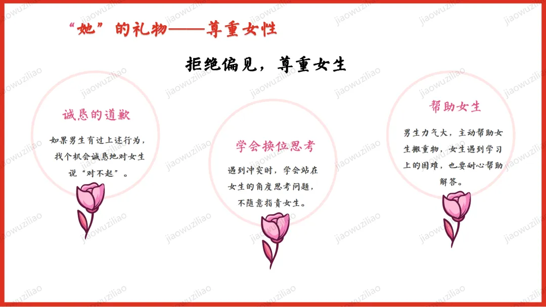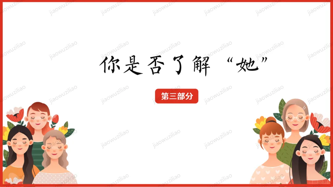 三月春风拂面,我们迎来三八国际妇女节。在生活中,母亲、老师、长辈与身边的女性,用温柔与坚强守护我们、温暖世界。本次班会,让我们学会感恩、尊重与赞美,向每一位了不起的女性致敬。愿同学们懂得关爱他人、珍惜付出,心怀敬意,向阳成长!如果您对这篇课件感兴趣,文末有课件的获取方式(PPT无水印,可编辑修改)关注下方卡片公众号有偿获取。(关注后+小编好友,再发课件的编号【3051】或截图。)免责申明:此资料来源于网络公开资源,仅用于学习交流使用,售价为整理资料的费用,我们尊重原创,版权归原作者。,如果侵犯到您的权益,请第一时间联系我们,我们将立即更正或删除相关内容.