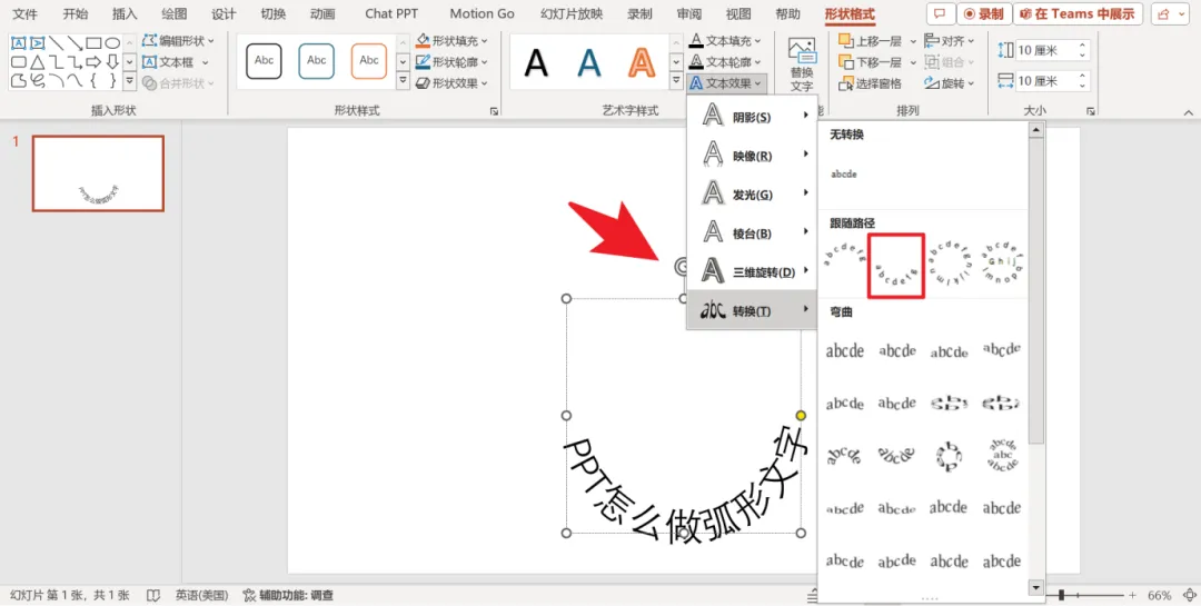 点击“转换”,在下拉菜单中选择“跟随路径”。瞬间,文字就变成了弧形,虽然初步成型,但角度和大小可能还需要进一步调整。