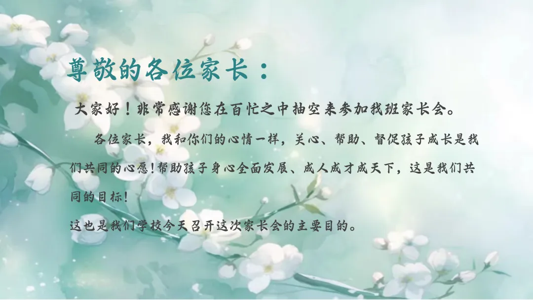 各位家长,我和你们的心情一样,关心、帮助、督促孩子成长是我们共同的心愿!帮助孩子身心全面发展、成人成才成天下,这是我们共同的目标!