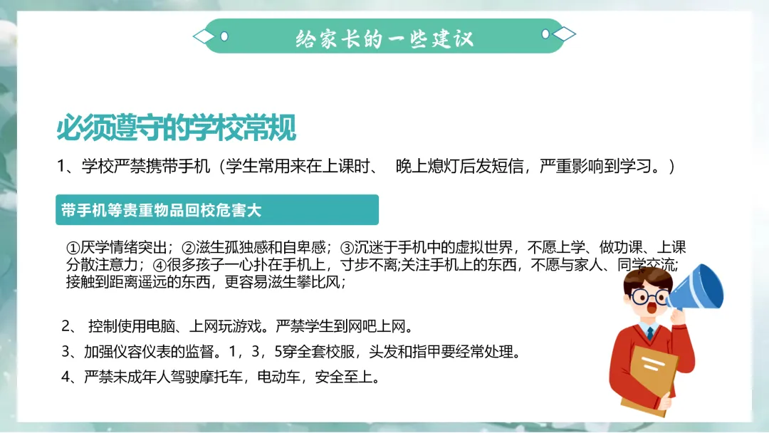 1”撒手不管“等同于"静待花开,而忽略了“默默耕耘”只看到了“静待花开”,静待花开是对结果的不强求,但不是过程的不作为,在孩子的眼界和格局还没有足够大的时候,他需要我们的指引,成长是孩子的责任,浇2.培养孩子耐挫力、同理心、好奇心、求知欲、想象力,这些都比短期学习成绩更重要。过程比结果重要,坚持长期主义,龟免赛跑最后赢的是乌龟不是兔子。有好的4、严禁未成年人驾驶摩托车,电动车,安全至上。