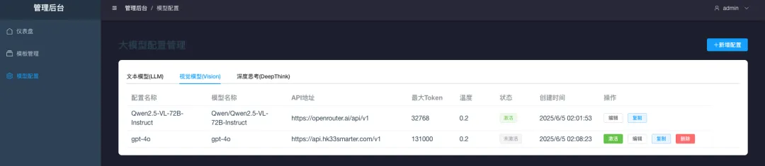 配置API_KEY:点击管理后台,分别配置LLM、VLLM、deepthink的API Key