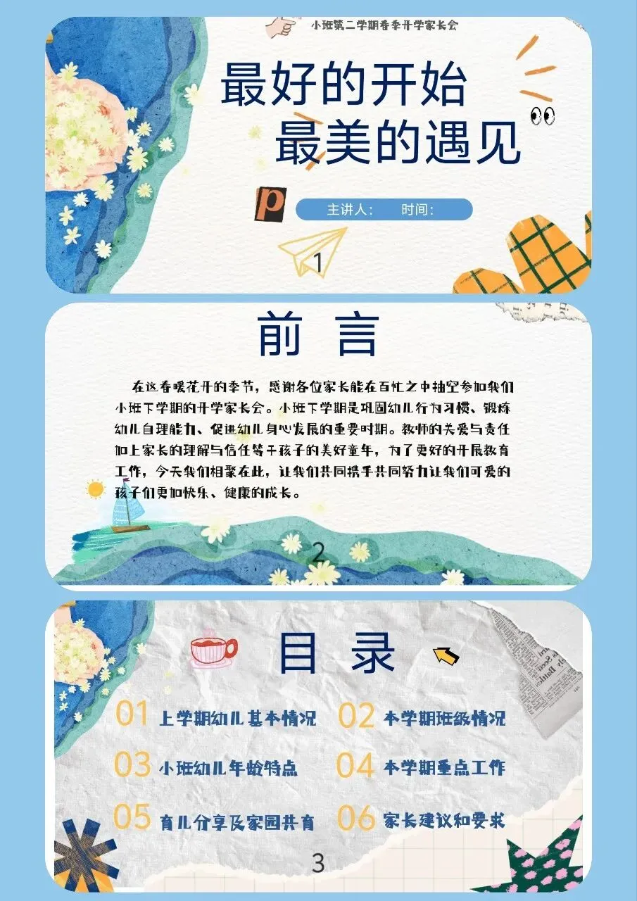 在这春暖花开的季节,感谢各位家长能在百忙之中抽空参加我们小班下学期的开学家长会。小班下学期是巩固幼儿行为习惯、锻炼幼儿自理能力、促进幼儿身心发展的重要时期。教师的关爱与责任加上家长的理解与信任等于孩子的美好童年,为了更好的开展教育工作,今天我们相聚在此,让我们共同携手共同努力让我们可爱的孩子们更加快乐、健康的成长。在这次家长会上,我将围绕以下几个方面进行介绍: