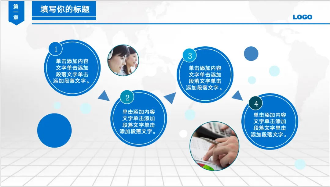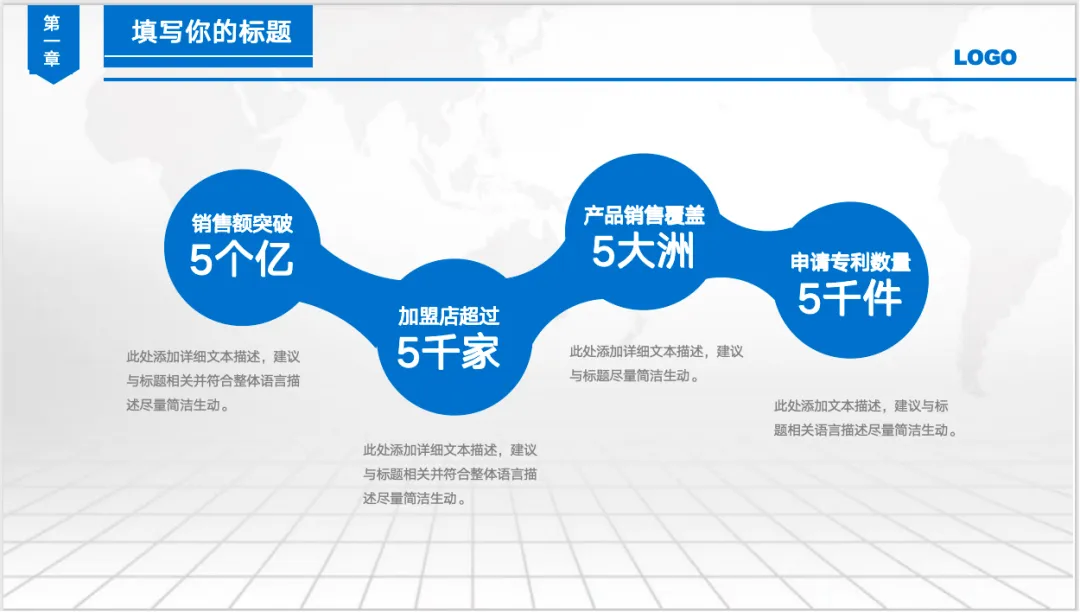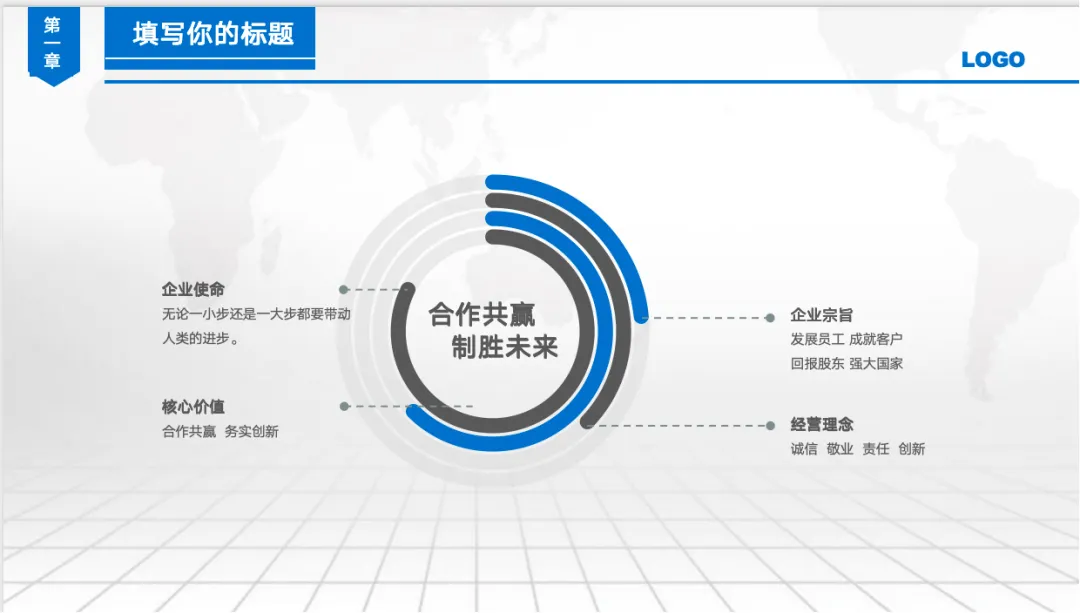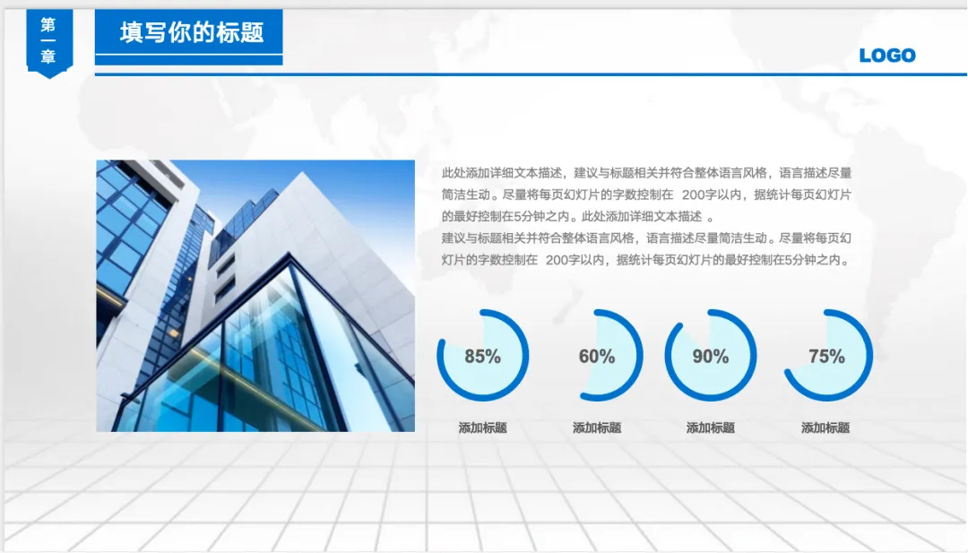这套模板采用了目前流行的扁平化设计风格,配色以经典的商务蓝为主基调 。大面积的留白辅以精致的线条,营造出一种不显山不露水的“质感”。