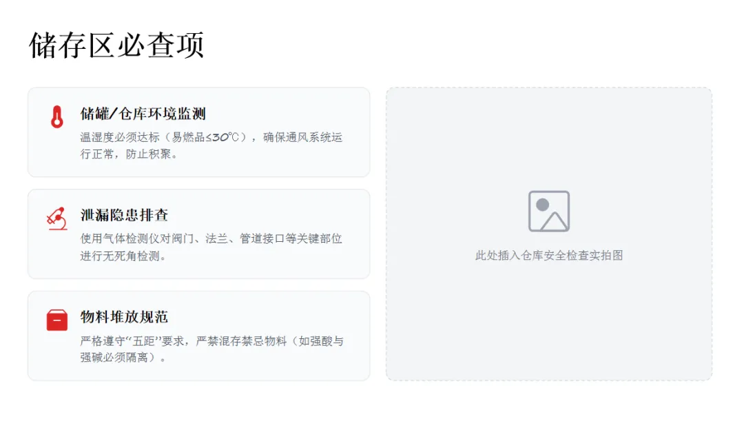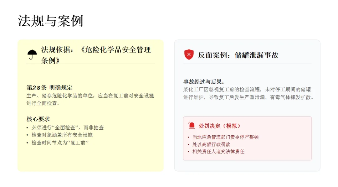针对危化品行业特点,详细讲解了储存区检查、装卸作业规范、应急准备及相关法规要求。