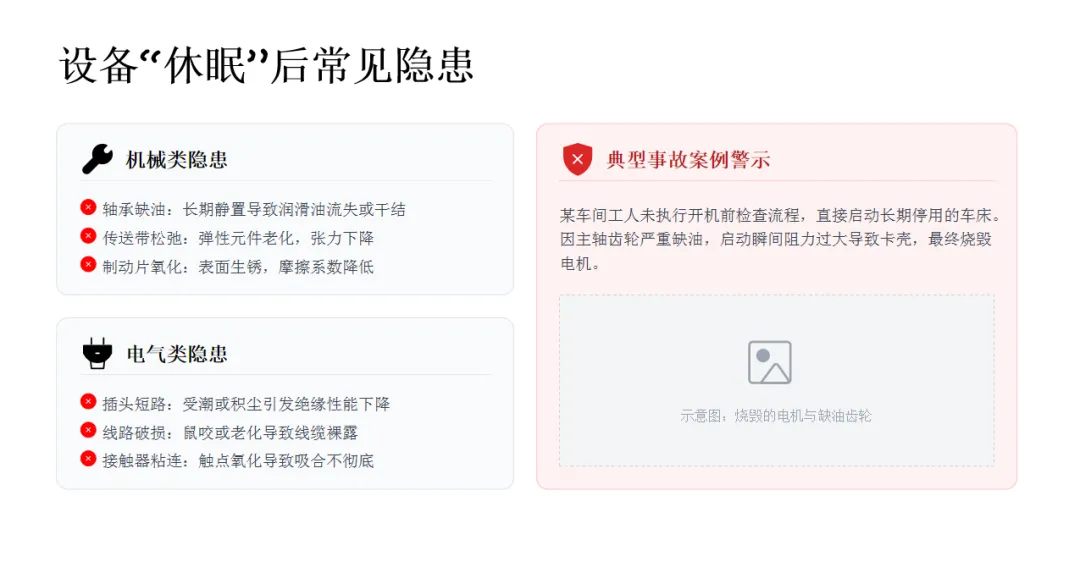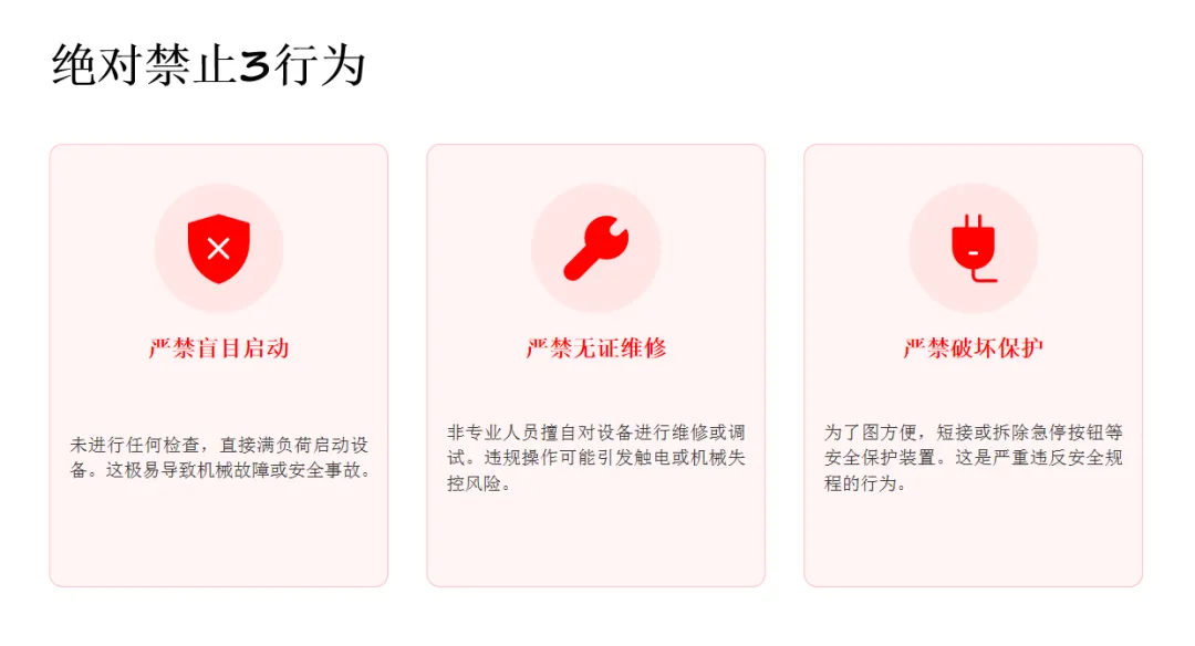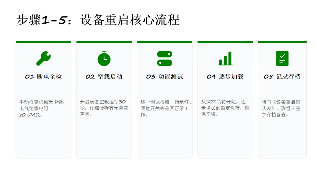 清晰地展示了设备从停机到安全运行的五个核心步骤,并强调了绝对禁止的危险行为。