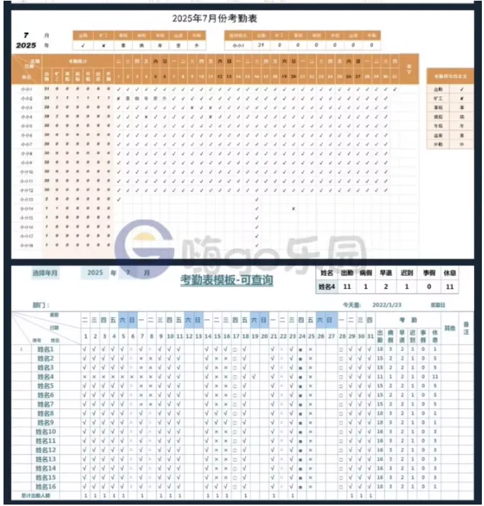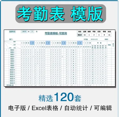 考勤表电子版模板excel公司员工工地工厂出勤记录带公式自动统计