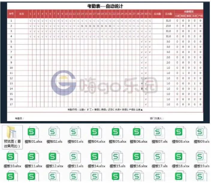 >考勤表电子版模板excel公司员工工地工厂出勤记录带公式自动统计