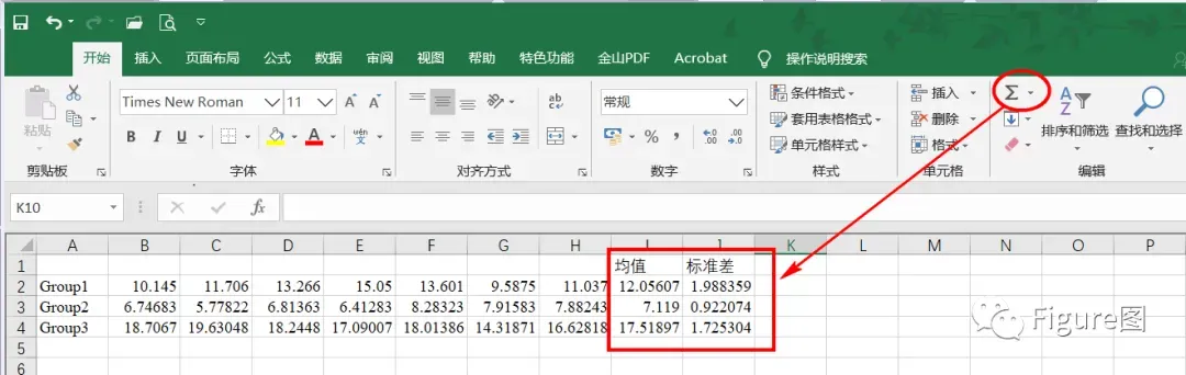 选择Excel文件类型之后,Origin的工作界面就会自动生成一个Excel工作簿,可以采用Excel的数据表格编辑功能对数据进行统计和编辑,如下图,计算各组数据的均值和标准差