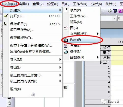 1、打开Origin,点击“文件”——“新建”——“Excel”,如下图