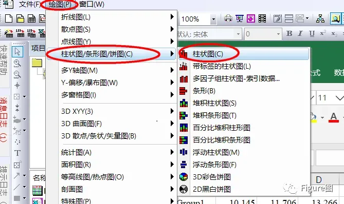 2、使用Excel工作簿中的数据进行绘图:单击菜单栏的“绘图”选项,根据数据选择适宜的图表类型,本教程选择为“柱状图”,如下所示