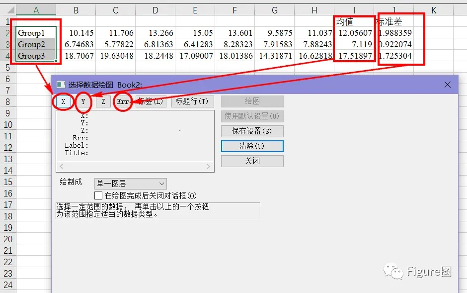 3、选中Excel表格中相应的行和列,点击对应的数据类型,如下所示,分组为X,均值为Y,标准差为Err