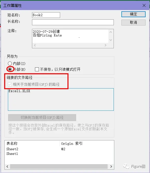 如果想将该Excel工作簿独立保存,则在上图中的“另存为”选择“外部”,软件默认勾选了链接文件,因此当独立打开Excel工作簿对绘图区域内的数据进行修改时,相应的图表内容也会自动修改。