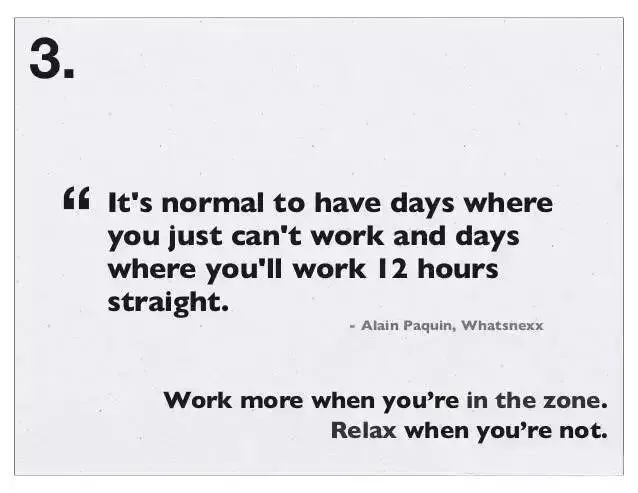 3、当你在状态时,就多干点;不然就好好休息:有时候会连着几天不是工作状态,有时在工作状态时却又能天天忙活 12 小时,这都很正常的。