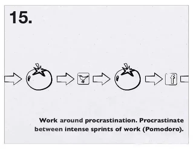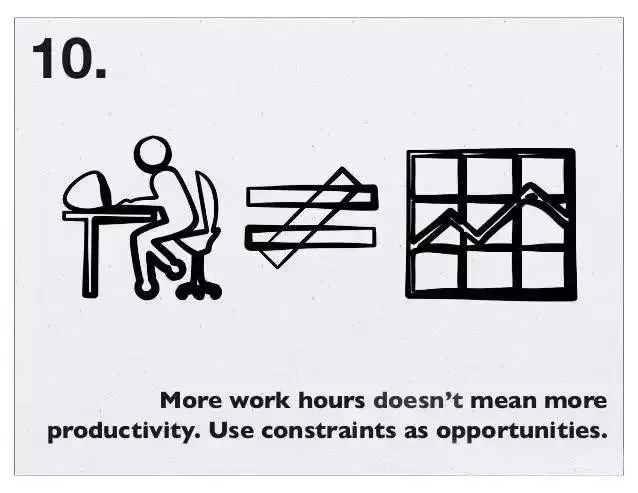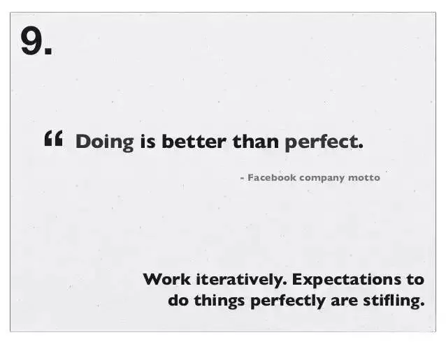 9、迭代工作,期待完美收工会令人窒息:“做完事情,要胜于完美收工” Facebook 办公室墙壁上贴的箴言。动手做,胜过任何完美的想象。