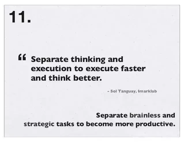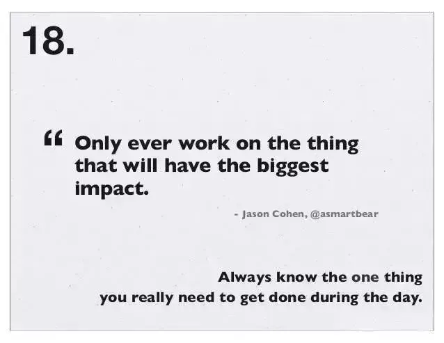 18、必须清楚白天必须完成的那件事,是什么。“Only ever work on the thing that will have the biggest impact” 只去做那件有着最大影响的事情。—— Jason Cohen