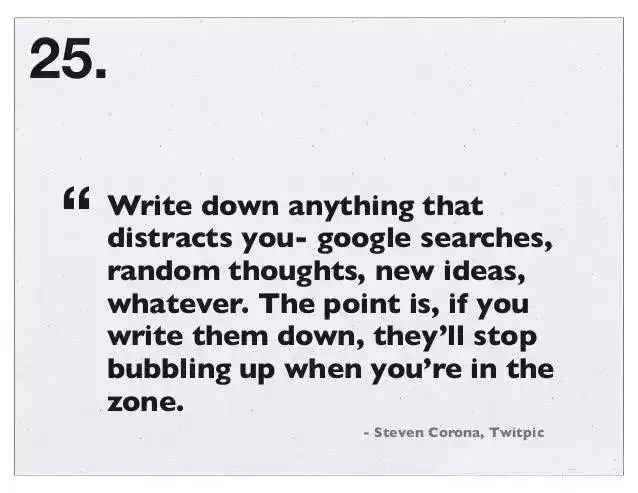 25、进入高效状态后,记下任何分散你注意力的东西比如Google搜索词、灵光乍现的想法、新点子等等。如果你把它们记下来,它就不会再蹦来蹦去了。