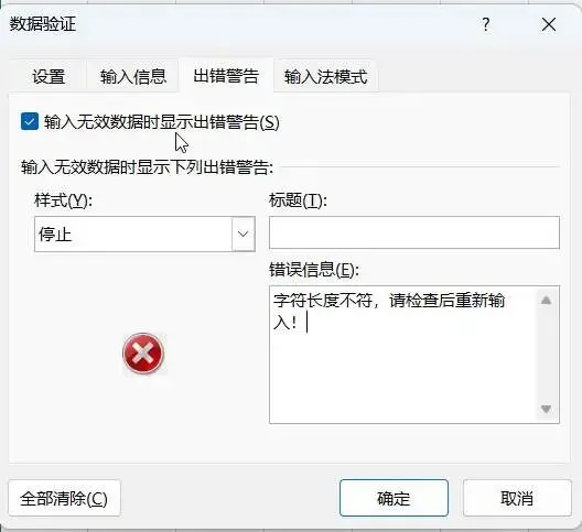 4、在设置单元格内输入字符,不符合规则时提示如下,重新进行正确输入即可。