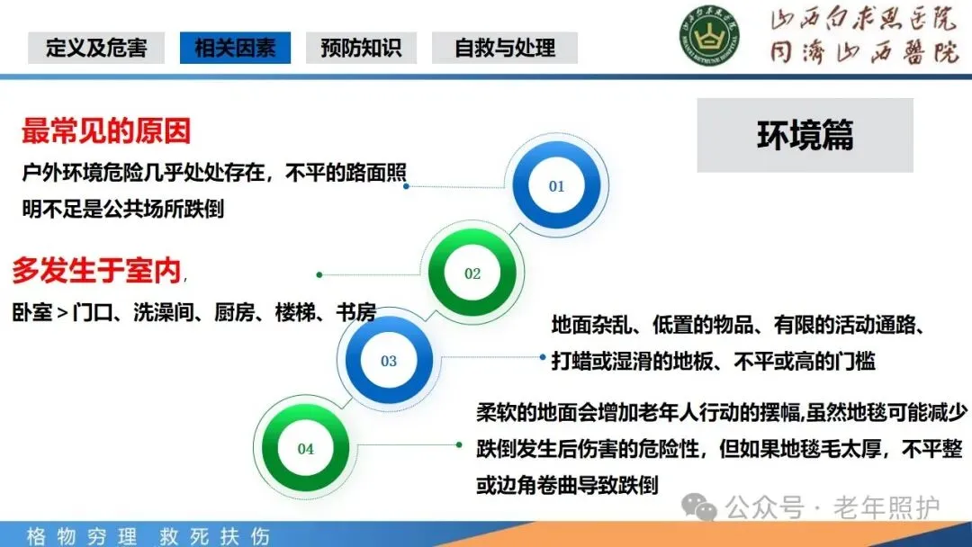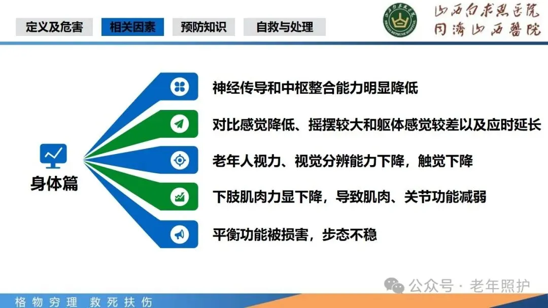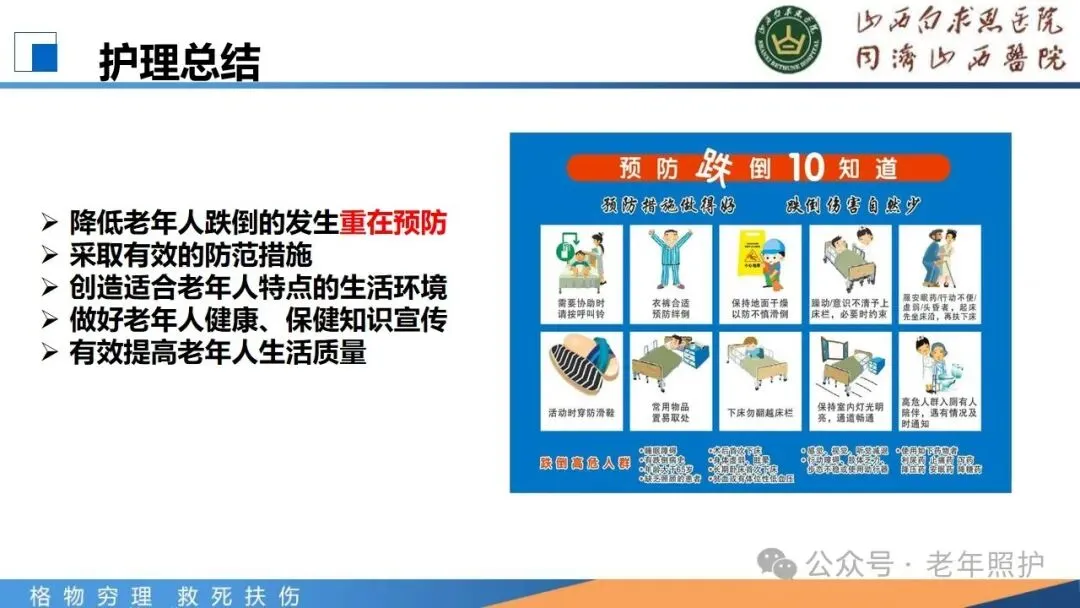 在身体层面,预防跌倒能有效减少骨折、颅脑损伤等严重身体伤害的发生。避免骨折可以防止老年人长期卧床,从而减少因长期卧床引发的如肺部感染、泌尿系统感染、压疮和深静脉血栓等一系列并发症,保障老年人的身体健康和生活质量。