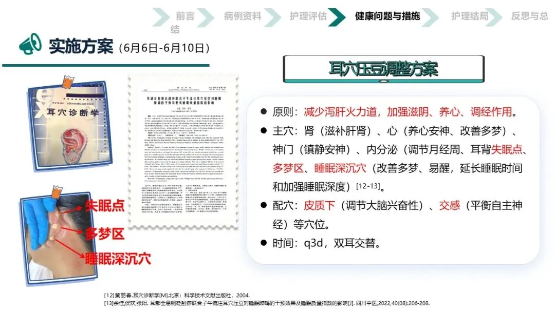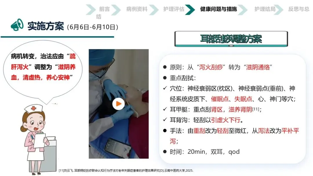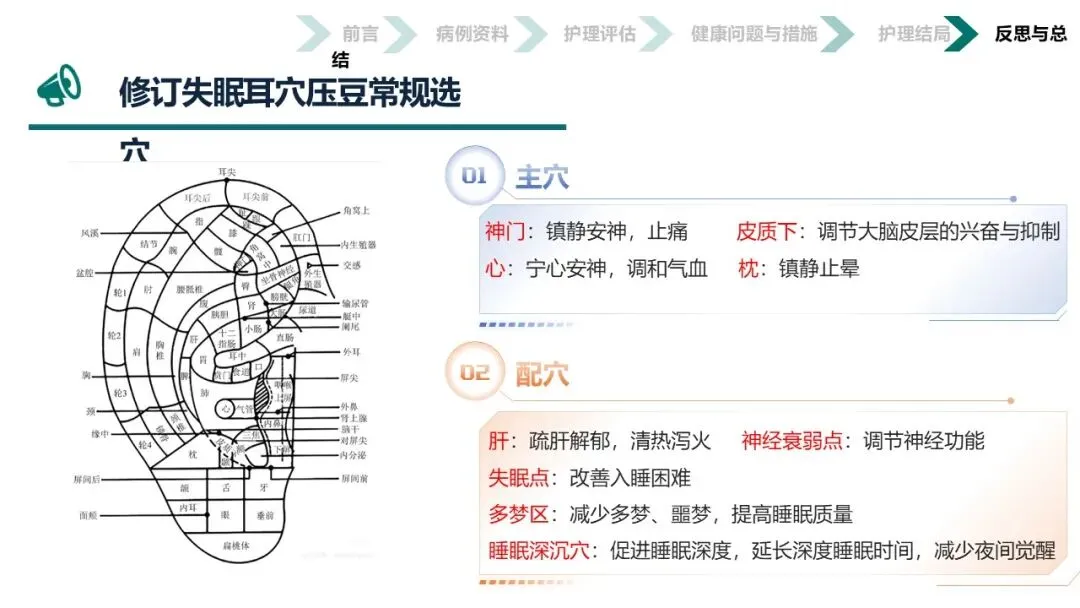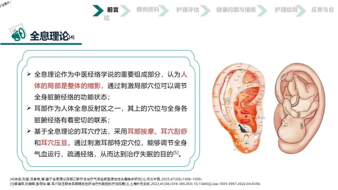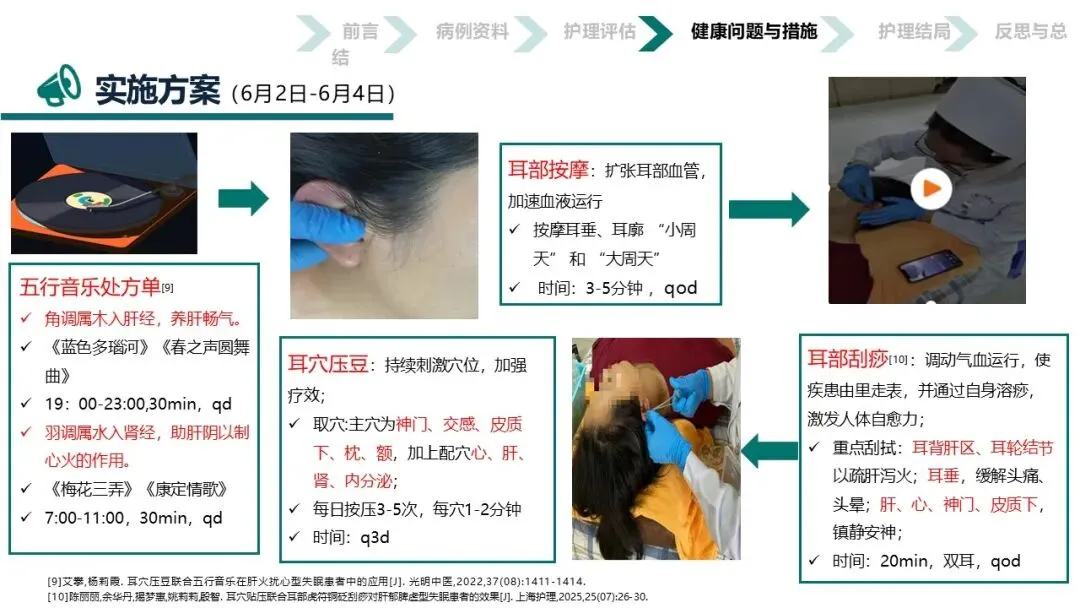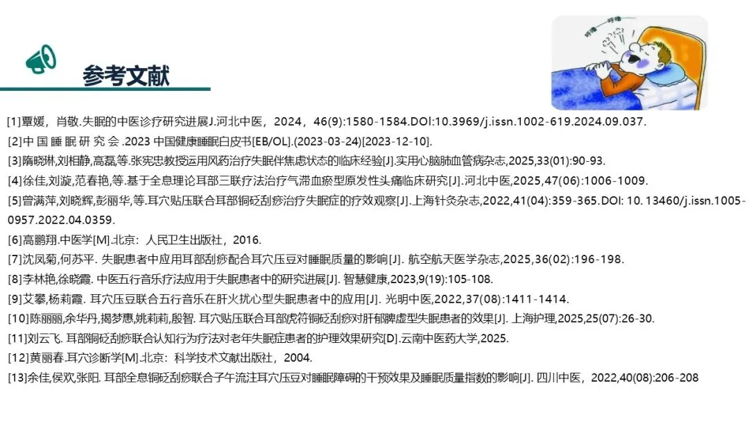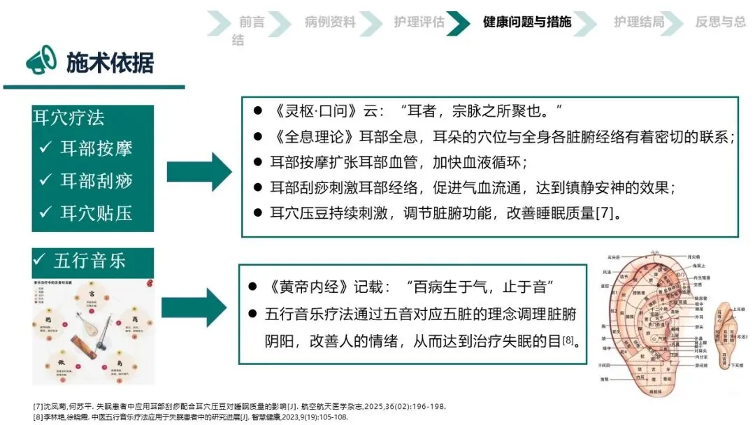 本案例将“耳为宗脉之所聚”的传统智慧与五行音乐疗法相结合,通过耳穴按摩、刮痧、压豆及辨证施乐等“简、便、验、廉”的非药物疗法,不仅显著改善了患者的睡眠质量和焦虑状态,验证了中医护理在失眠管理中的独特优势,更为在基层推广具有中医特色的失眠防治方案提供了宝贵的临床范本和实践依据,彰显了中医“辨证施护”的现代价值。