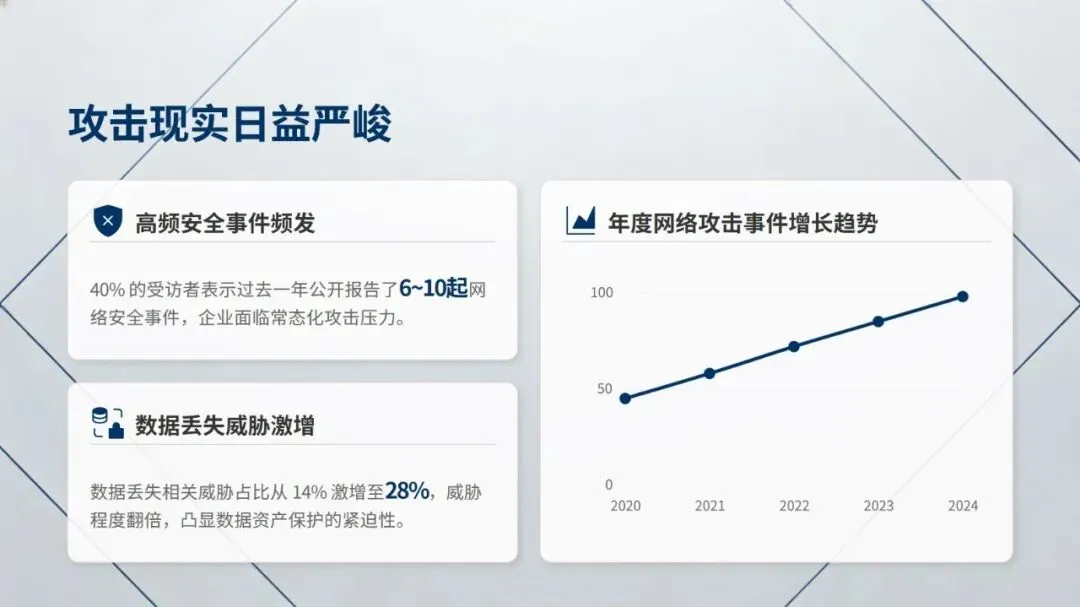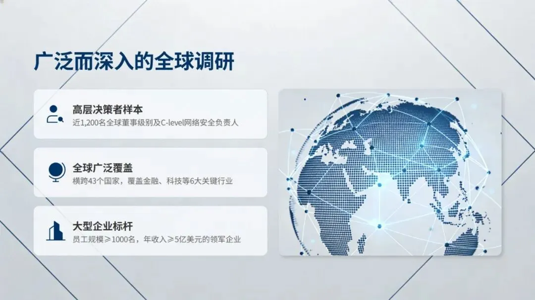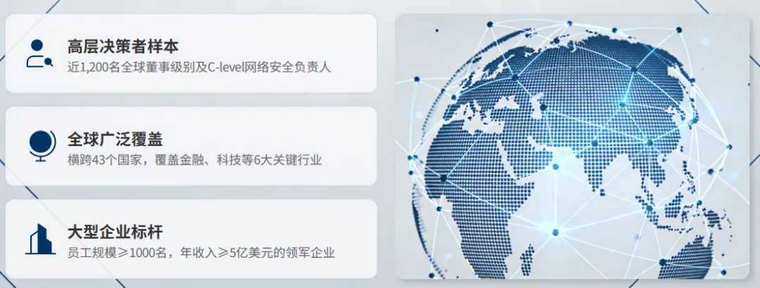 全球网络安全前瞻调研报告依托广泛且深入的全球调研完成,调研覆盖近 1200 名全球董事级别及 C-level 网络安全负责人,横跨 43 个国家、6 大关键行业,聚焦员工规模超千名、年收入不低于 5 亿美元的大型领军企业,以精准理解网络安全未来趋势、挖掘其商业价值潜力、为企业高层提供数据驱动的战略指导为三大核心目标,清晰展现了网络安全领域的发展新态势。