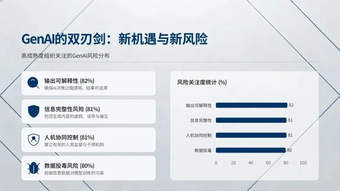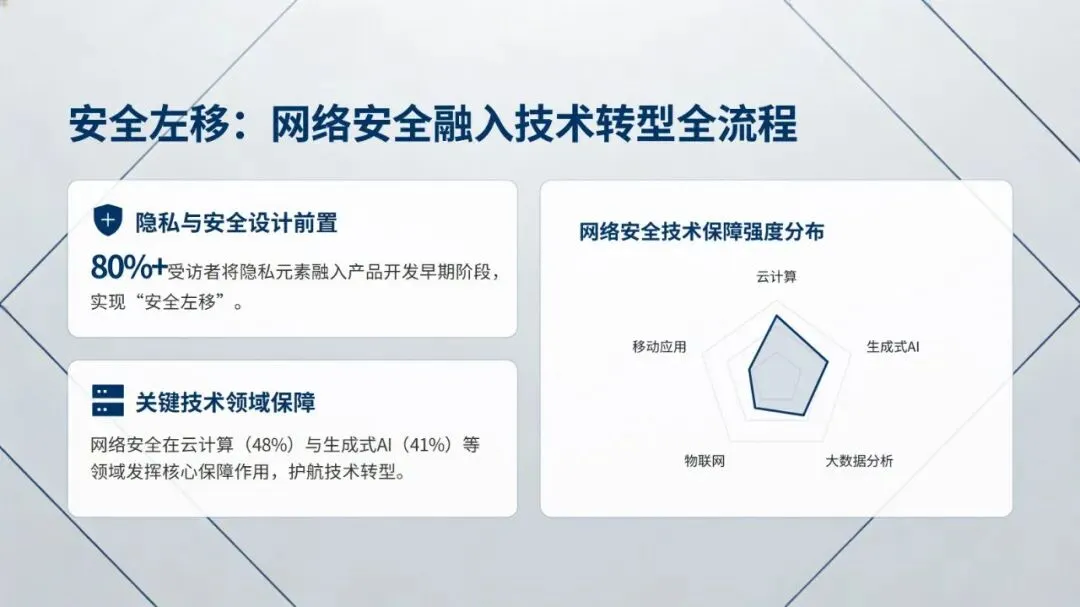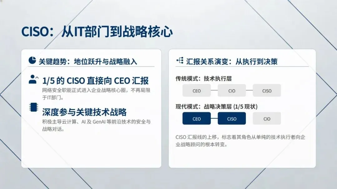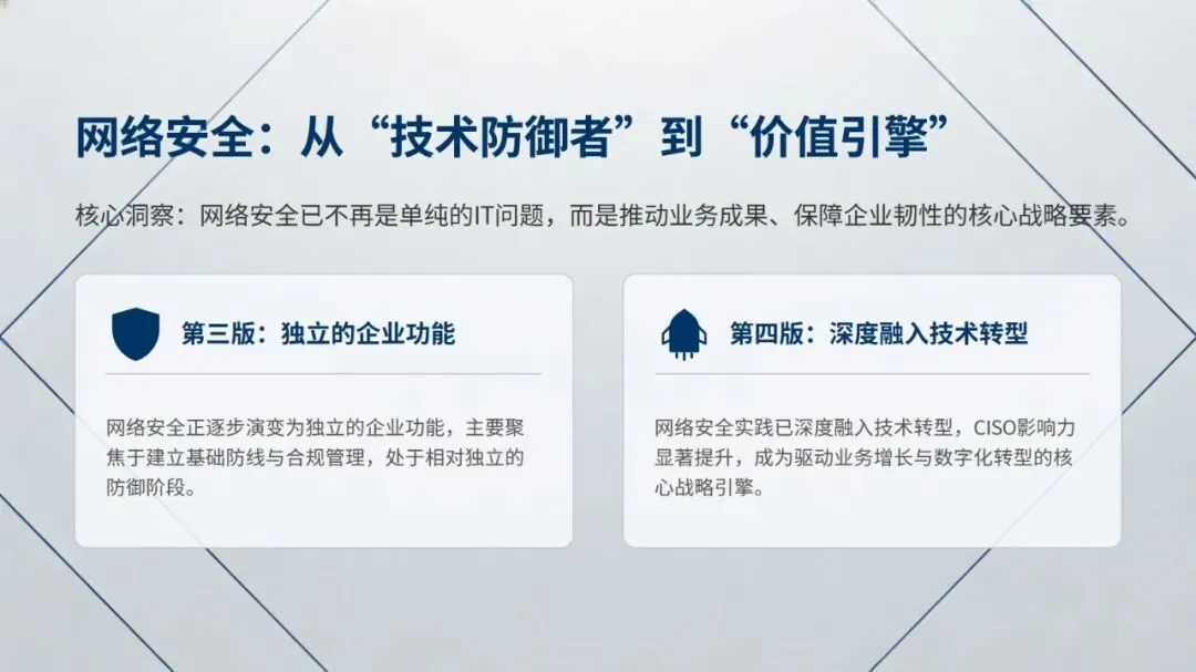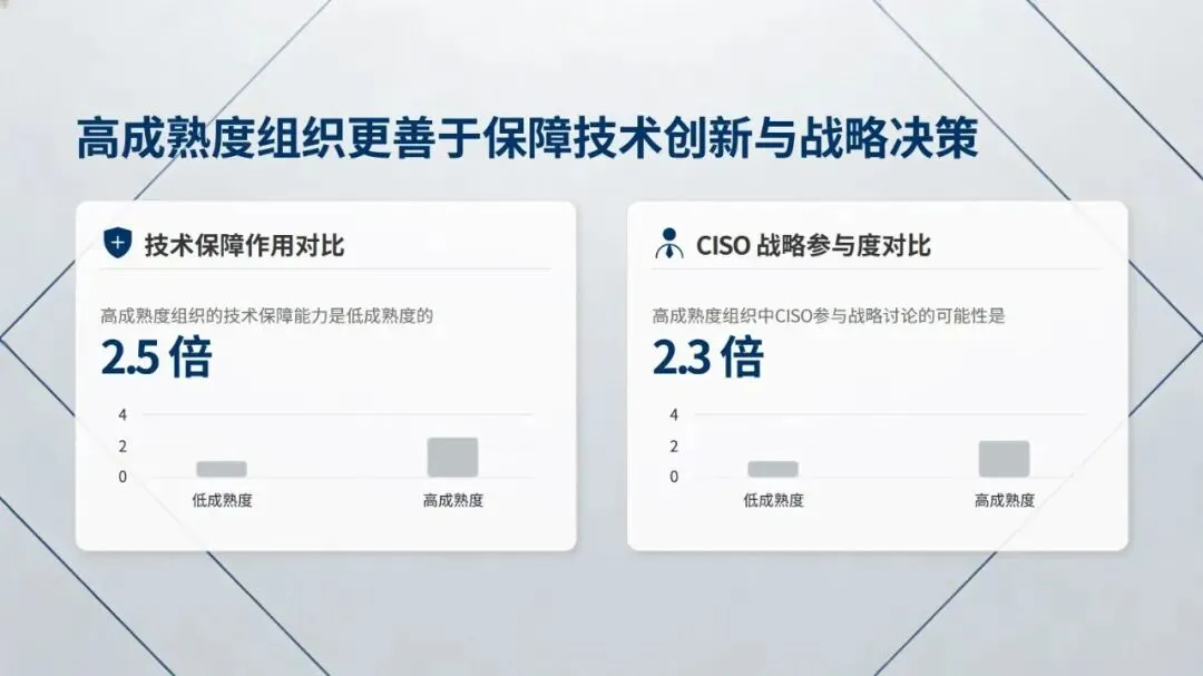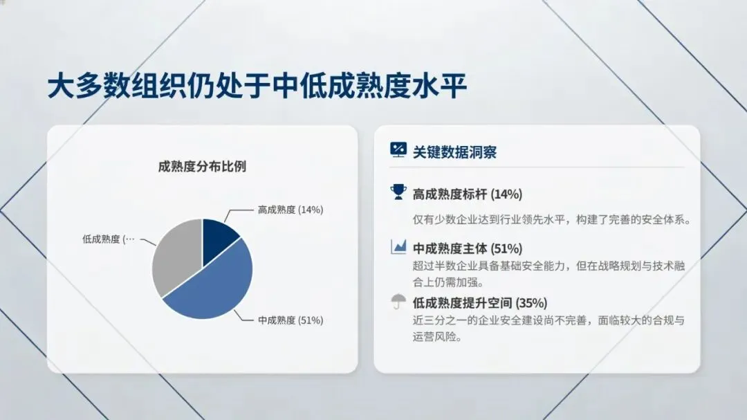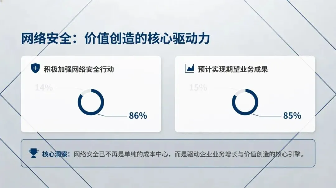报告提出四大核心发现:其一,网络安全成为战略商业价值核心,不再是成本中心,57% 企业计划增加安全预算,58% 将其与数字化转型预算整合,企业对安全事件的关切也从运营中断转向技术完整性信心丧失,且当前企业面临攻击常态化、数据丢失威胁翻倍的严峻现状;其二,CISO 角色实现战略转型,1/5 的 CISO 直接向 CEO 汇报,深度参与前沿技术战略制定,但行业存在高层信心鸿沟,CISO 需具备将技术风险转化为业务语言的能力;其三,网络安全与技术转型深度融合,超 80% 企业实现 “安全左移”,云计算、生成式 AI 为核心保障领域,39% 企业在安全项目中大量运用 AI 赋能防御;其四,网络安全成熟度决定企业韧性,仅 14% 企业达到高成熟度,但其在高层信心、业务成果等方面的表现是低成熟度企业的 2 倍以上,且 83% 企业已着手应对量子计算带来的安全威胁。