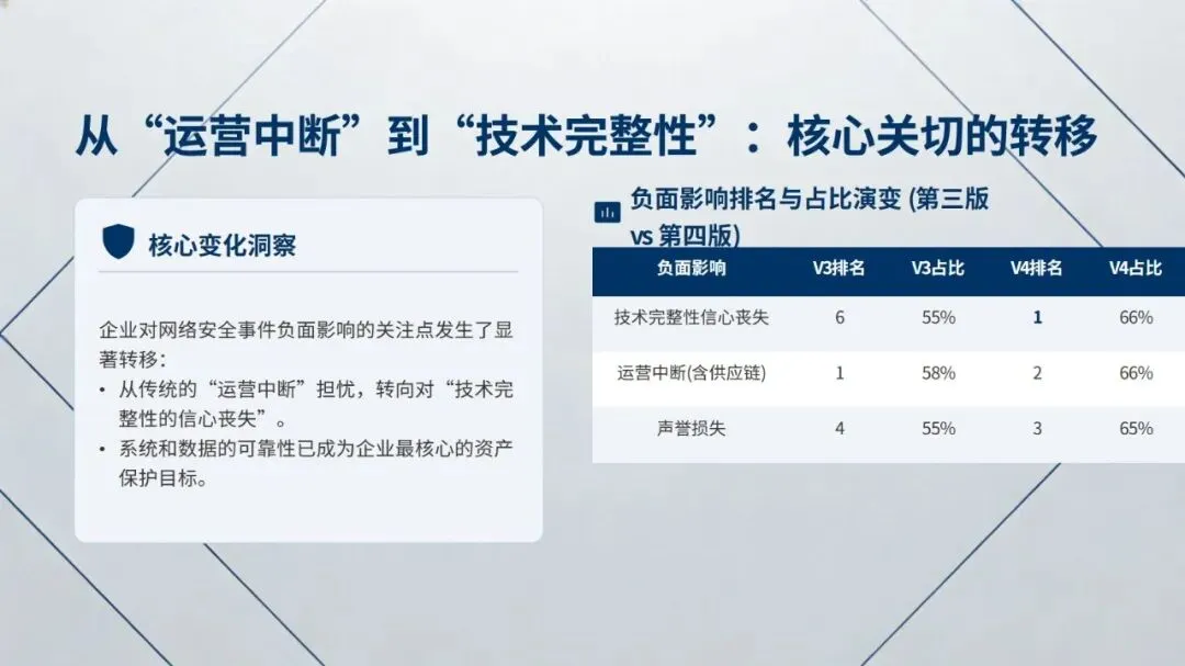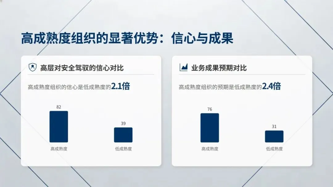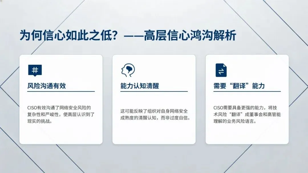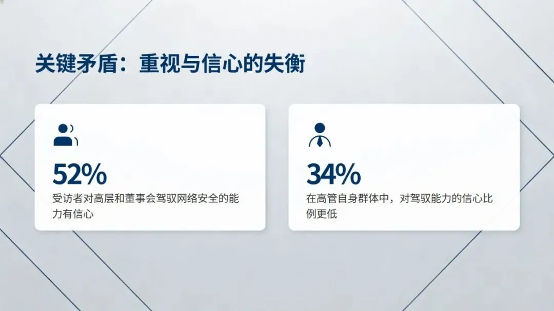 报告从高层视角指出,网络安全已从单纯的 IT 问题转变为企业核心战略要素,完成了从 “技术防御者” 到 “价值引擎” 的转型,正深度融入企业技术转型进程,但行业普遍存在重视与信心的失衡问题,仅 52% 受访者对高层和董事会驾驭网络安全的能力有信心,高管自身群体的信心比例更低,仅为 34%。