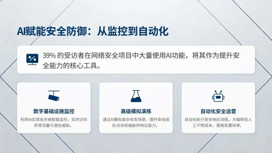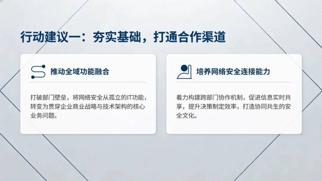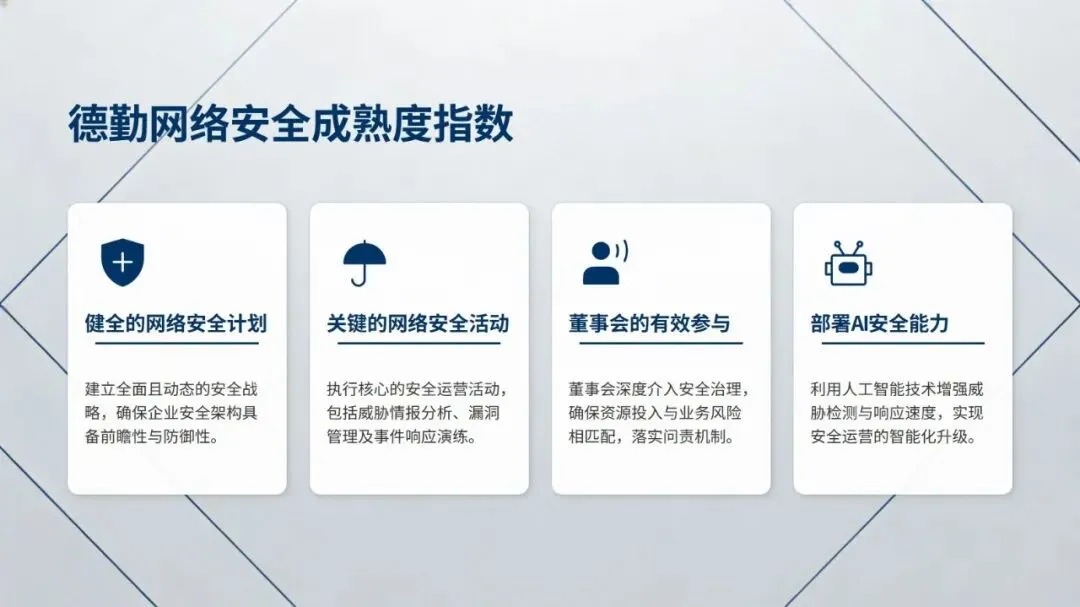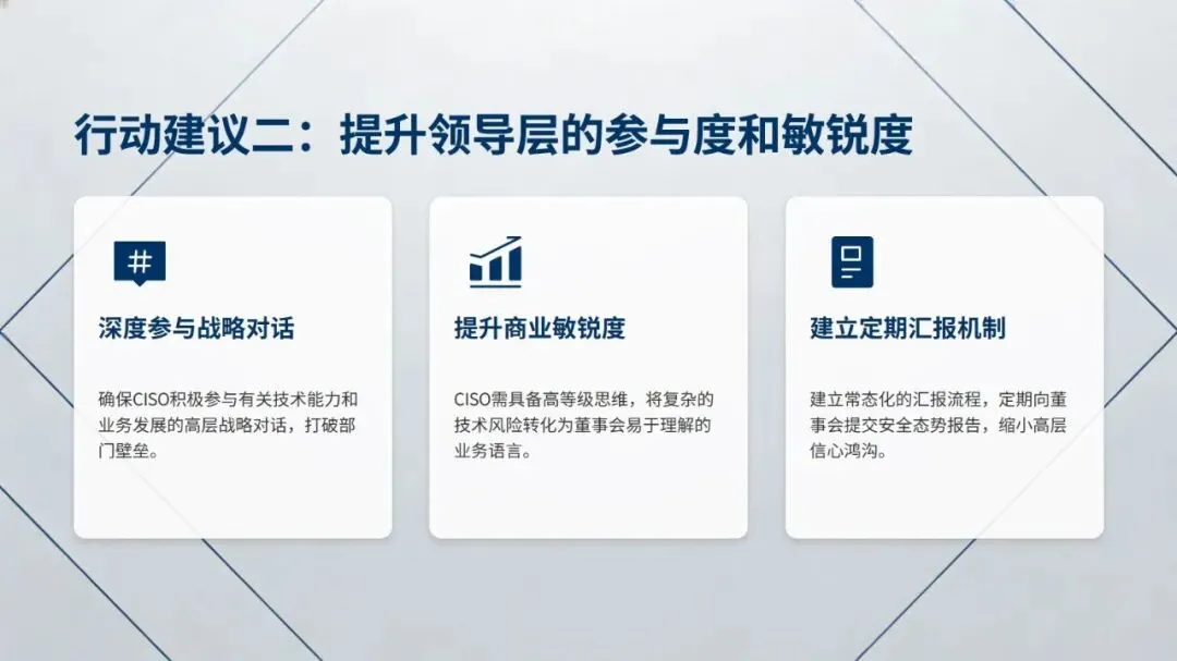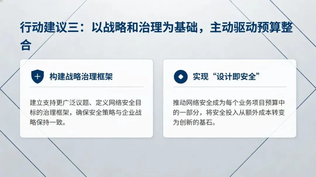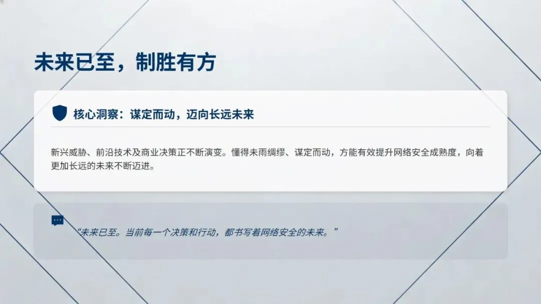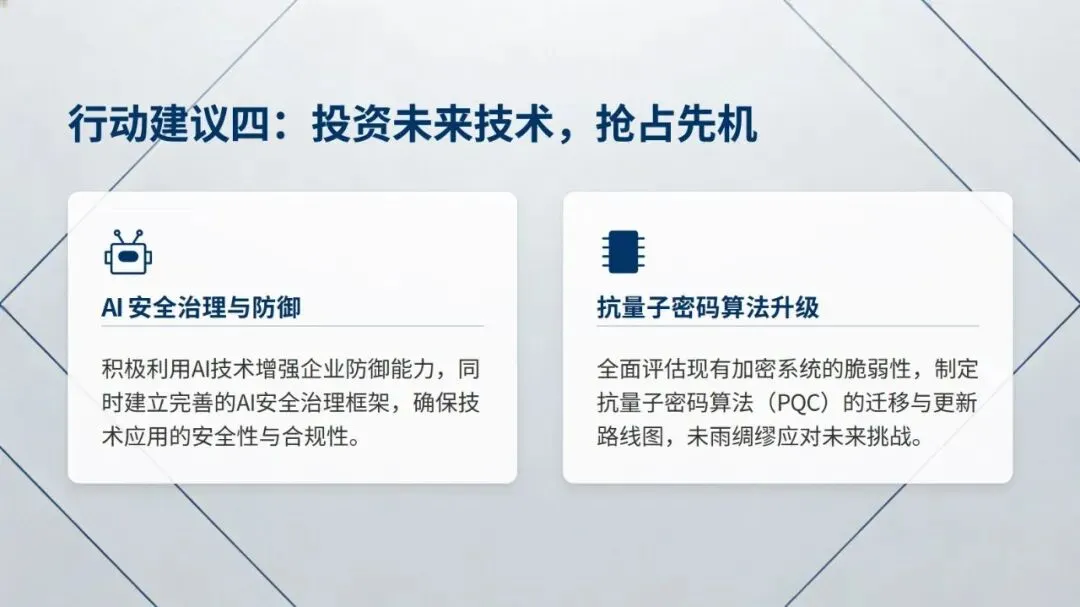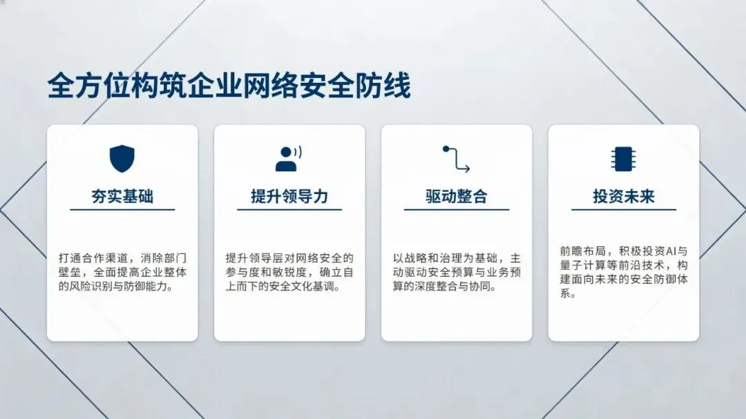 最后,报告从夯实基础打通合作渠道、提升领导层网络安全参与度、驱动安全与业务预算深度整合、前瞻投资 AI 与量子计算等前沿技术四方面,给出了全方位构筑企业网络安全防线的行动建议,为企业提升网络安全成熟度提供了清晰方向。