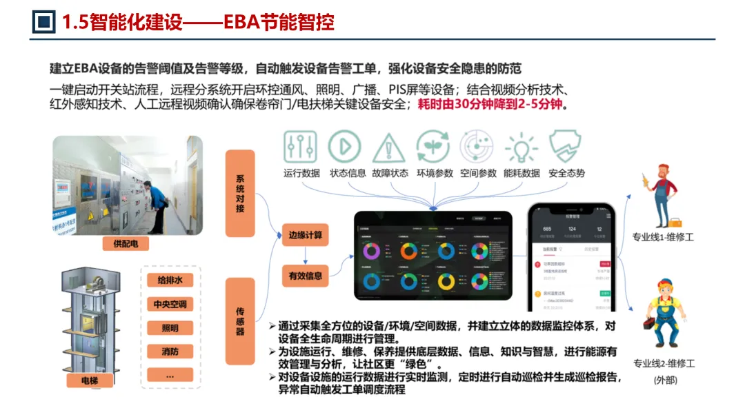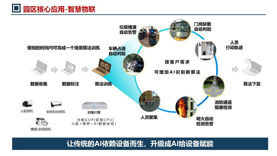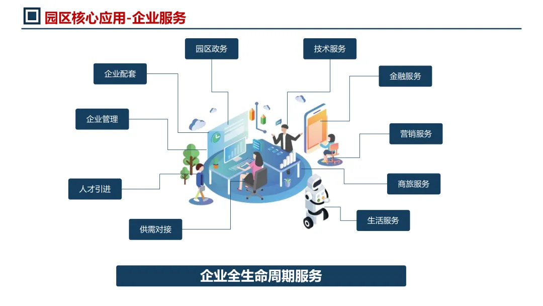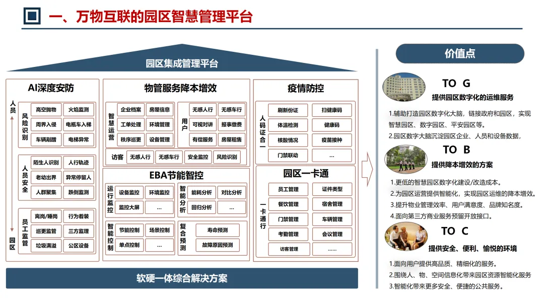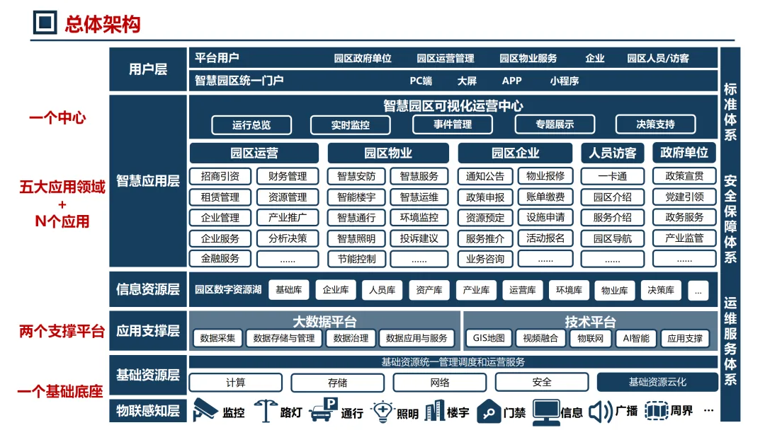 本方案针对传统产业园区基础设施薄弱、信息孤岛、运营管理能力不足等痛点,依托人工智能、物联网、大数据等新一代信息技术,构建“透彻感知、全面互联、深入智慧”的智慧园区体系,实现降本增效、智能安防、节能环保与产业升级。总体架构:方案以“一个基础底座、两个支撑平台、五大应用领域、N个应用、一个中心”为核心框架。物联感知层与基础资源层构建云化基础设施;信息资源层汇聚企业、人员、资产、产业等基础库;应用支撑层通过大数据平台与AI技术平台实现数据采集、治理与应用服务;智慧应用层覆盖园区运营、招商引资、租赁管理、企业服务等业务;用户层通过统一门户面向政府、运营方、物业、企业、人员提供PC端、大屏、APP、小程序等多渠道服务;智慧园区可视化运营中心实现实时监控、事件管理与专题展示。核心业务设计:智慧物联层面,通过智慧灯杆集成、AI+智慧安防、视频巡检、智慧运营、EBA节能智控、疫情管控等系统,实现万物互联与设备赋能。视频监控赋能人员聚集、消防通道占用、电动车入楼等场景,从事后处理转向前置发现;EBA系统对供配电、供排水、空调、电梯、照明等设备多维度数据采集监控,实现节能智控。智慧运营层面,构建全过程招商管理、租赁管理、业财一体化与数字运营大脑,通过数字孪生与AI分析掌控园区运行状态,实现人、事、物可视可管可控。智慧服务层面,整合政务服务、产业服务、报事报修、查账缴费等资源,为企业提供全生命周期服务。系统运维与资产管理:基于全局一体化运维平台,实现设备运行实时数据展示、智能化告警、资产分类管理与维保记录追踪。工单管理支持多节点、多层级、多方式提醒,确保执行效率。园区一卡通构建“卡码脸”多识别模式,集成门禁、考勤、餐厅消费、会议签到等应用。综合效益:方案实现以人为本的工作生活环境优化,绿色高效的资源空间配置,以及全生态多元化的服务增值,有效提升园区品牌效应与运营效益。