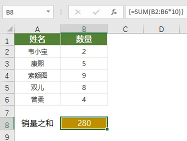 总结一下,由于 B2:B6*10 在计算之后,会返回多个结果,因此公式需添加大括号。