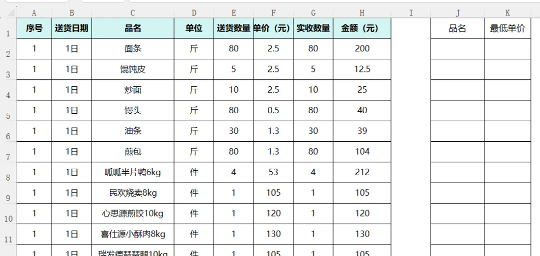请在J列输入公式,提取C列每个品名对应的F列单价的最低价是多少。