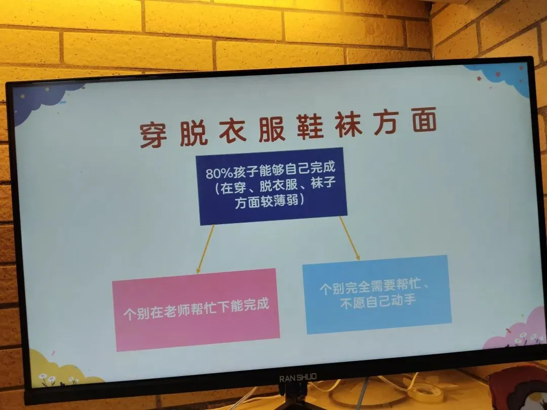 我们孩子自己穿鞋:100%,入睡率:100%、友好相处:84%、平稳愉悦情绪进园:97%、独立按时完成吃饭:82%