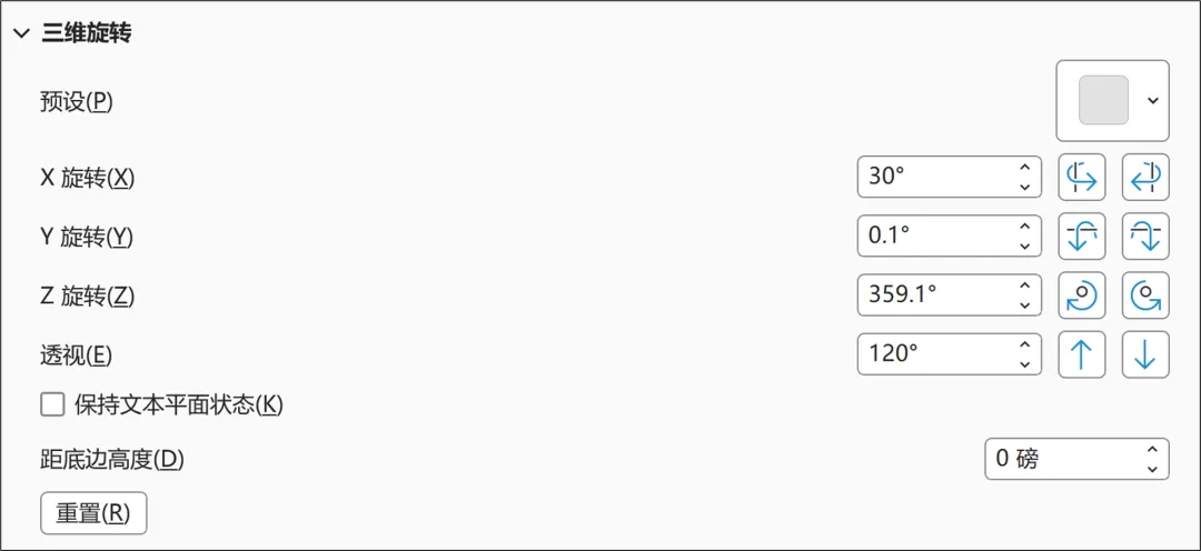 这我们打开文本效果选项,里面选择三维旋转。这是我的参数。