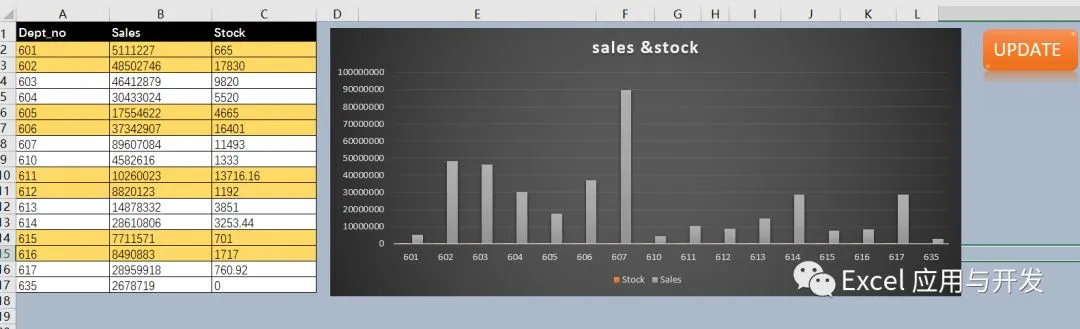 左边是一个工作表格,右边是一个由工作表生成的图表,右上角是一个用来更新的按键。模板表格的数据需要每天更新。按我们常规的做法是打开数据源,对数据源进行整理,将整理好的数据复制到模板的数据源的表中实现对模板的更新。如下图所示为数据源表: