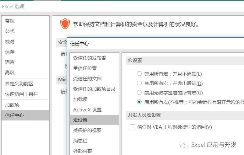 另外我们还需启用宏——选择 文件-选项-信任中心-宏设置-启用所有宏
