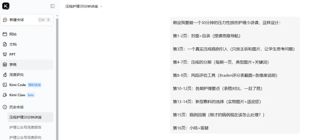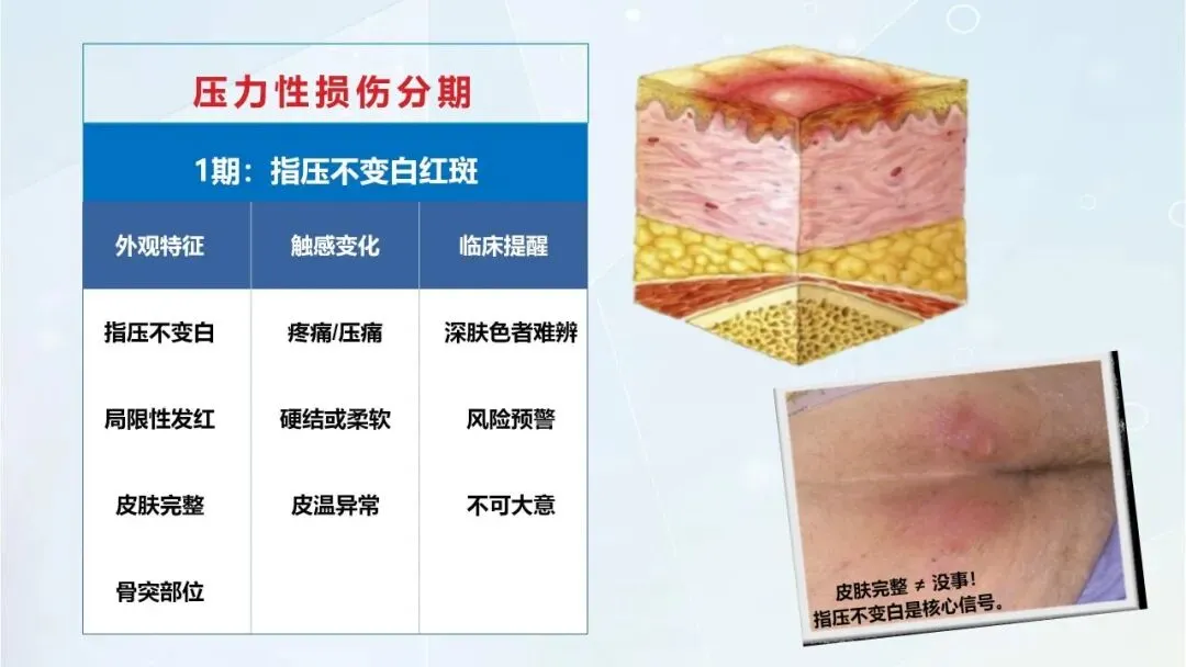 二、医学类PPT的“三要三不要”1. 要图片,不要大段文字医学内容往往抽象,比如压力性损伤的分期,光用文字描述“1期压力性损伤:局部皮肤完整,有指压不变白的红斑”,学生很难形成印象。但放一张1期压力性损伤的真实图片,配上“红斑、指压不变白”几个关键词,效果立竿见影。 我的原则及简单示例:PPT上只放提示性文字和关键图片,大段的解释由我嘴里讲出来。这样听者既能看到重点,又能听我展开,注意力不会分散。