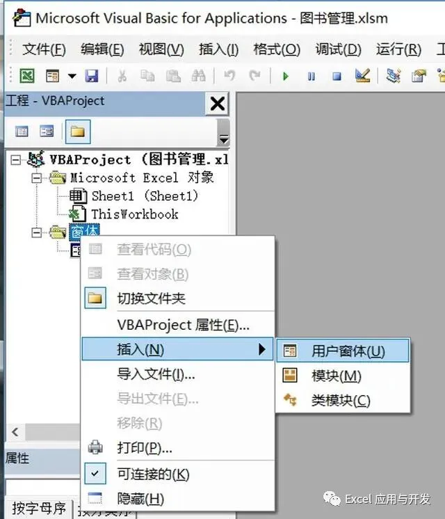 按ALT+F11在VBE编程环境中创建窗体,如下图所示,右键点窗体-插入-用户窗体